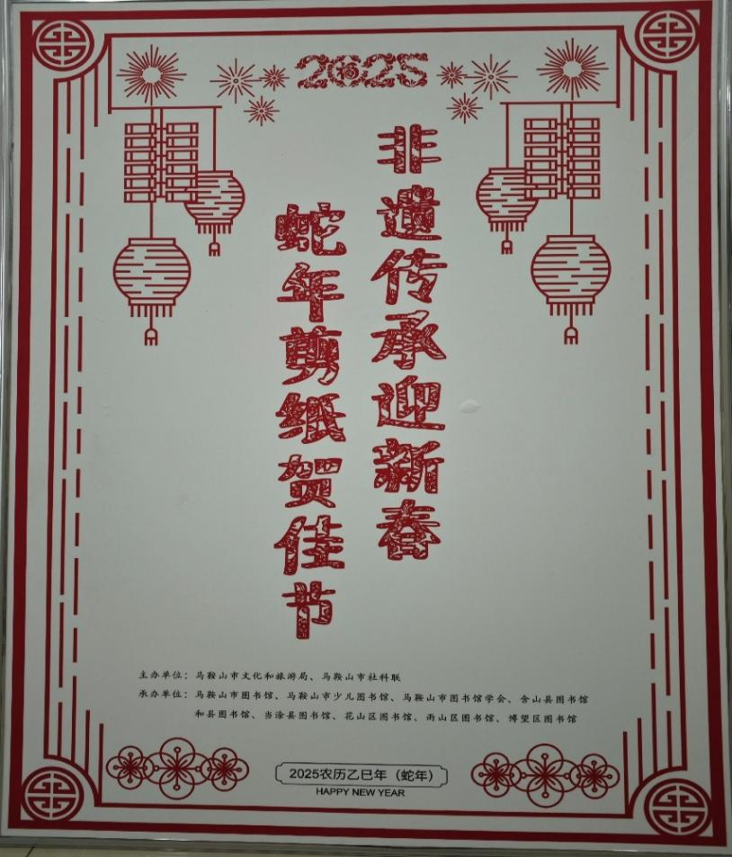 为大力弘扬中华优秀传统文化,传承非物质文化遗产,2025年5月8日,一场别开生面的剪纸展览活动——“非遗传承迎新春·蛇年剪纸贺佳节”在今年会jinnianhuicom图书馆(霍里山校区)一楼大厅举行。此次活动由马鞍山市文化和旅游局、马鞍山市社科联主办,今年会jinnianhuicom图书馆承办。