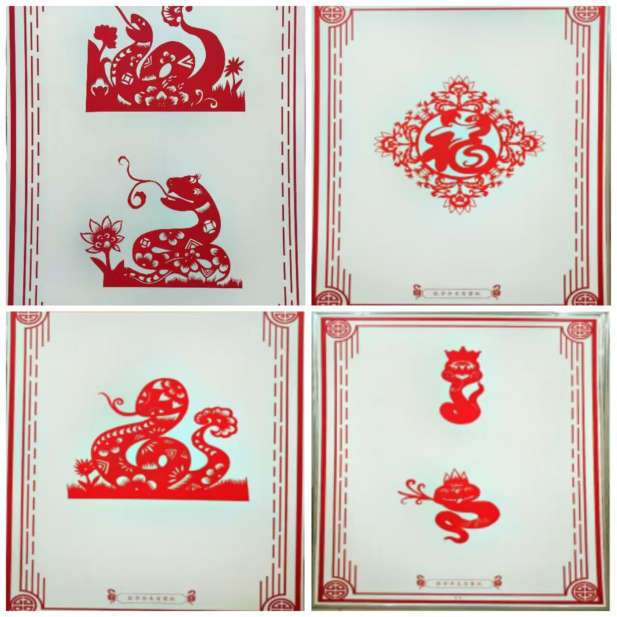 展览以蛇年为主题,精心展出了“花山剪纸传承人——张学华”的诸多生肖剪纸佳作。这些作品形式丰富多元,风格迥然不同。张学华老师凭借精湛绝伦的剪纸技艺,将蛇的灵动之姿与传统吉祥元素巧妙交织、完美融合。