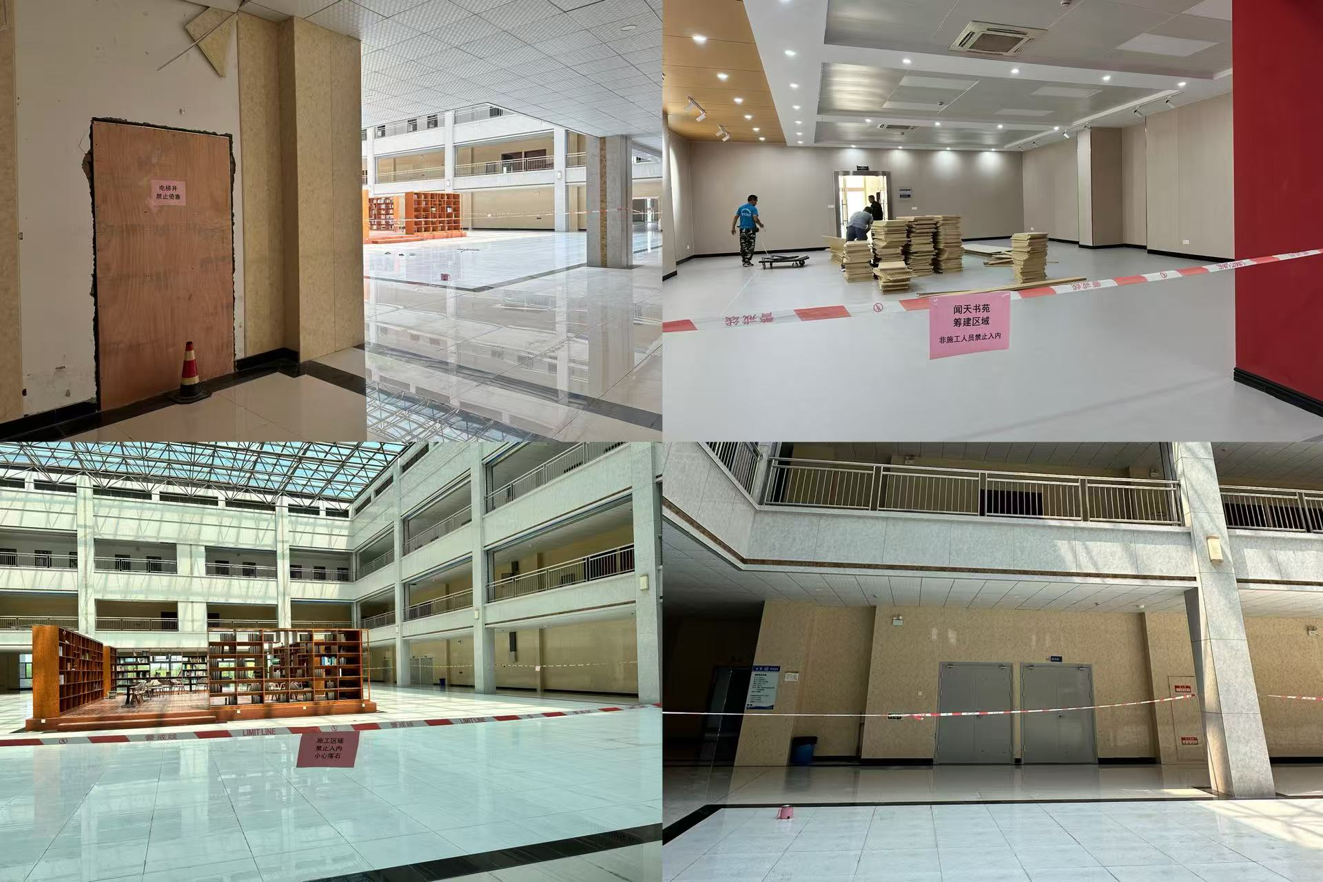 当前,郑蒲港校区图书馆正处于局部升级改造阶段,二层中庭及东西双向电梯井区域正在紧张施工中。受工程影响,多处天花板及墙面装饰板出现损毁,存在坠落风险。为确保师生安全,图书馆已对所有施工区域进行全面排查,拉设警戒线实行封闭式管理,确保学生通往自习室的区域安全无虞。迎新日前,全体馆员对自习室桌椅进行彻底清扫与维护,保障学习环境整洁舒适。尽管施工带来不便,但图书馆通过科学调度与贴心服务,力争最大限度保障新生的入馆体验。