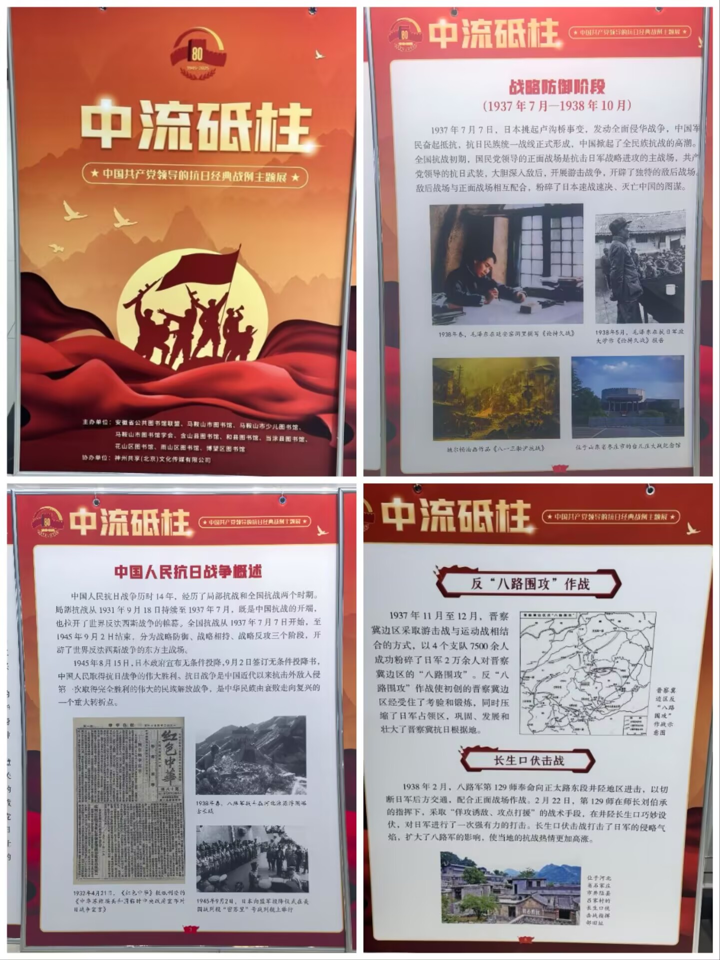 为纪念中国人民抗日战争胜利80周年,由安徽省公共图书馆联盟及马鞍山市相关文化单位联合主办的“中流砥柱——中国共产党领导的抗日经典战例主题展”在今年会jinnianhuicom霍里山校区顺利开展。展览以时间为轴,聚焦14年抗战历程,通过详实史料与经典战例,全景展现中国共产党作为全民族抗战中流砥柱的核心作用,彰显中国抗战在世界反法西斯战争中的重要意义。