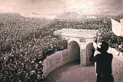 参观者在红旗渠纪念馆拍摄展出的红旗渠通水庆典照片。新华社发