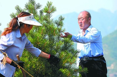 在红旗渠的故乡河南林州市,任村镇盘龙山村“独臂村支书”王生有(右)在新建的观景台上查看树木生长情况。新华社发