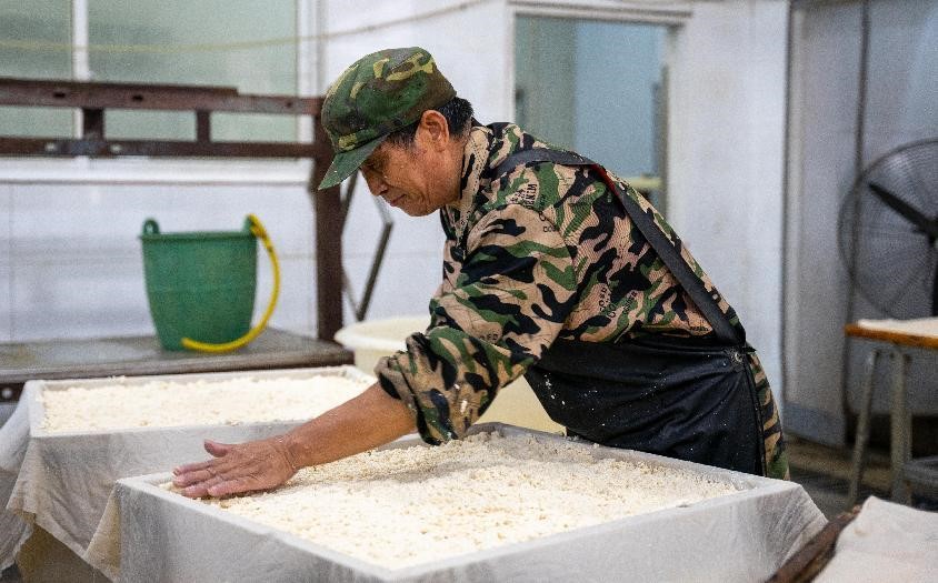 7月7日实践团队来到了毛豆腐制作工厂。毛豆腐历经了数百年的传承,其香味飘散在徽州的大街小巷,已经成为一种深刻徽州记忆的文化符号。实践团队与当地毛豆腐非遗传承人蒋光明先生取得了联系,蒋光明先生带领团队观看了毛豆腐制作过程:用优质黄豆,经筛选、浸泡、磨浆、过滤、压制、切块和发酵等工序,使毛豆腐这道经典徽菜更加极致。随着非遗的新见识、新视野的展开,毛豆腐不仅在当地大放异彩,也可以通过快递等新型传播方式“飞入寻常百姓家”,使广大人民的生活中不断植入非遗文化“基因”,播撒文化自信种子。当古老的非遗文化与新时代交织,相信会释放出更加绚丽的生命力,同时当代新青年也要积极响应非遗文化回归民间沛然生长,融入生活历久弥新的号召。