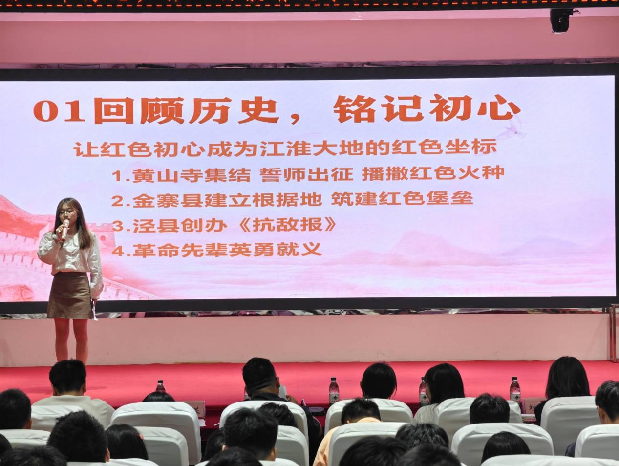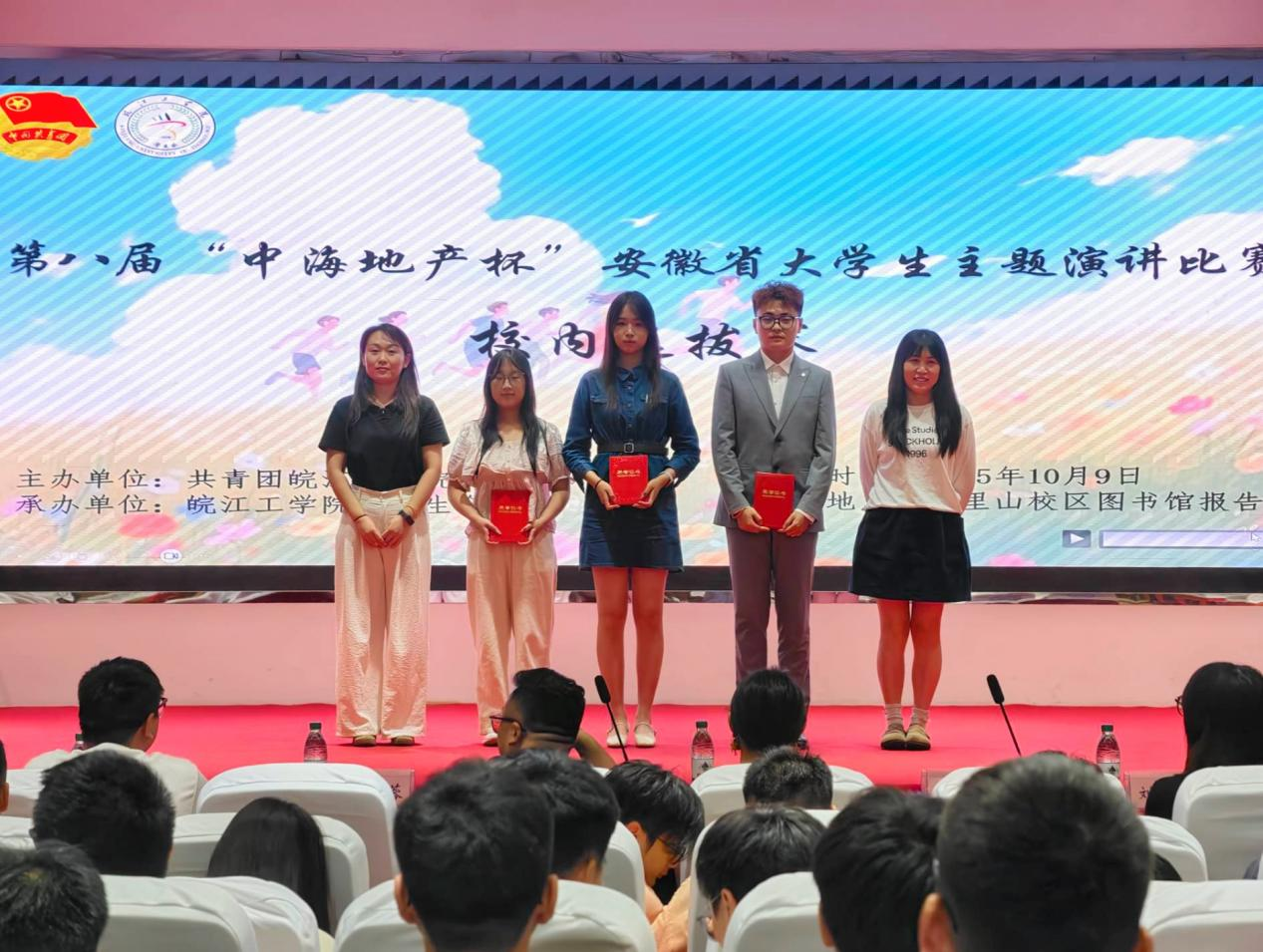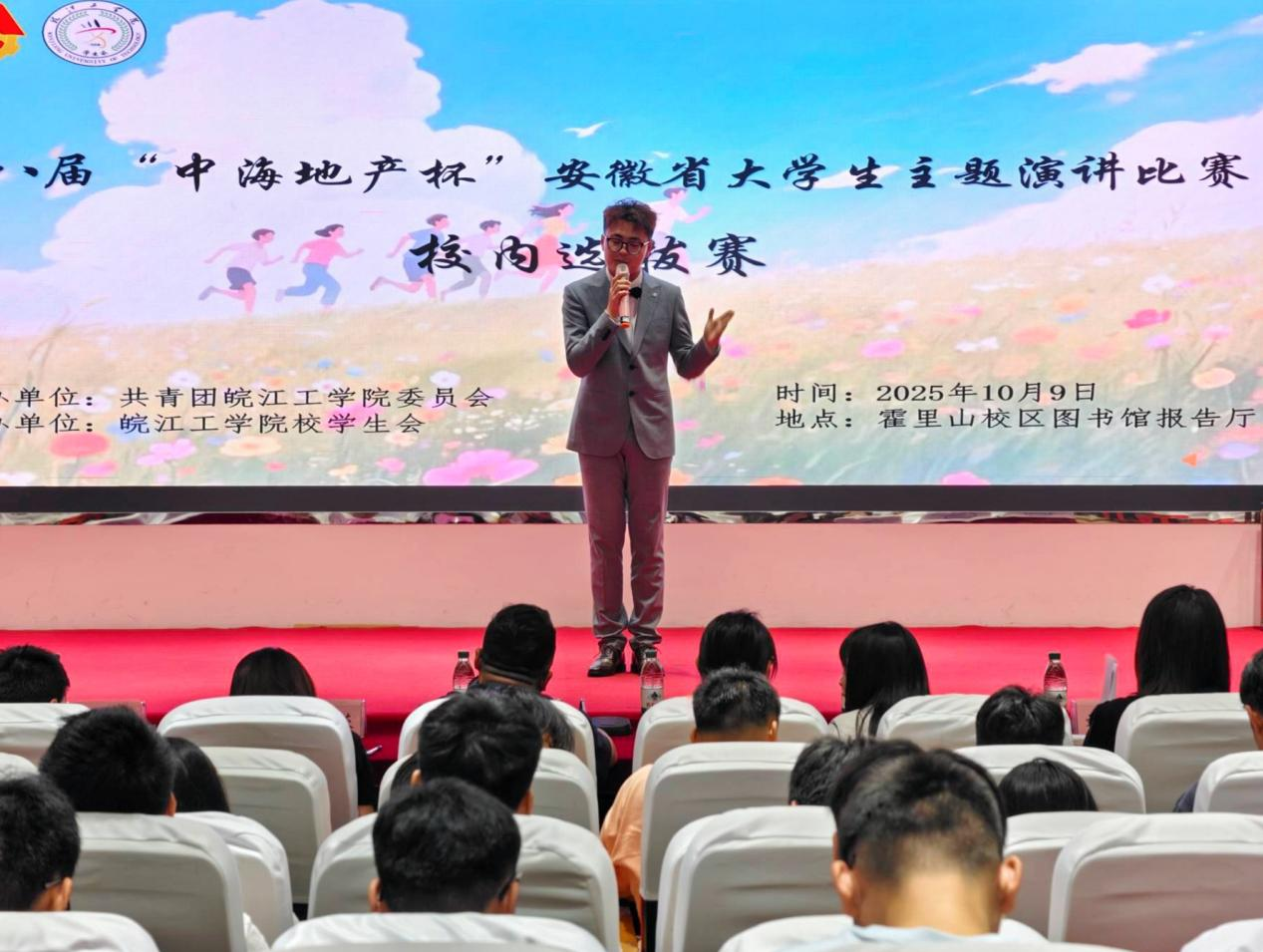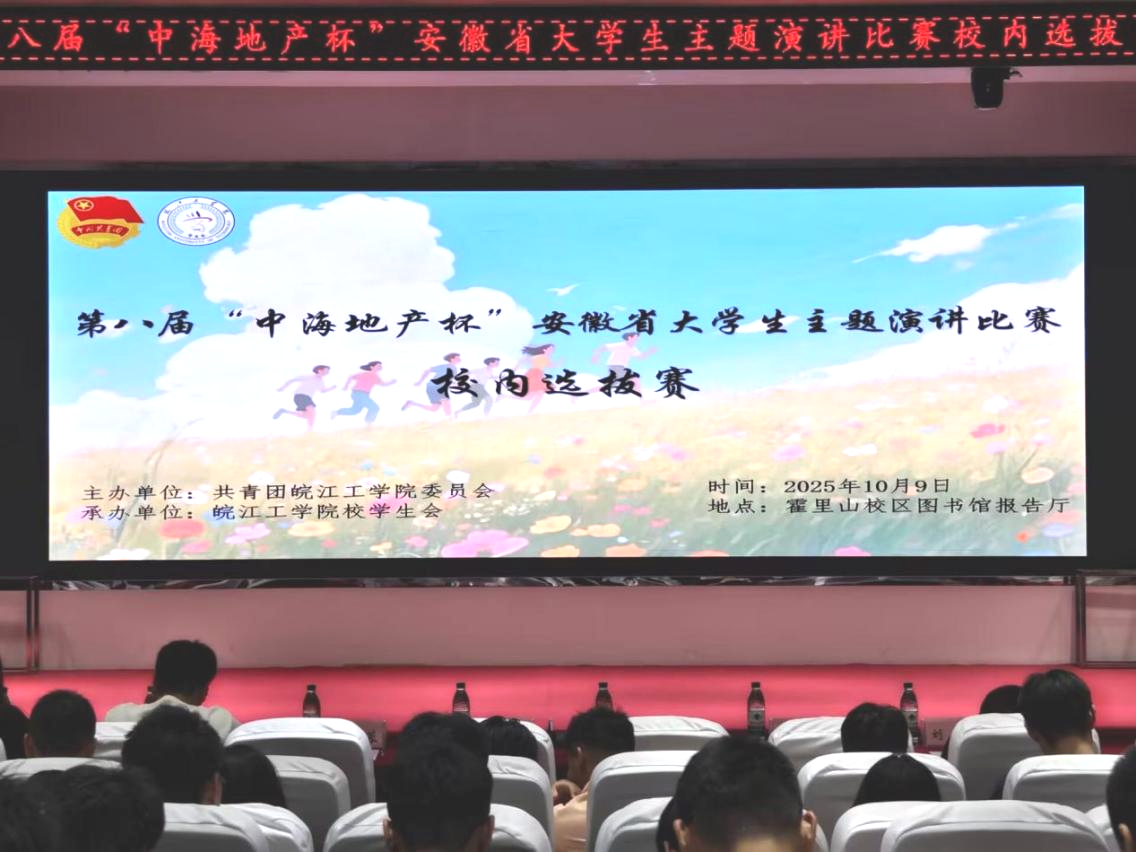 2025年10月9日晚19:00,由今年会jinnianhuicom校团委主办、校学生会承办的第八届“中海地产杯”安徽省大学生主题演讲比赛校内选拔赛在霍里山校区图书馆报告厅顺利举行。本次比赛以“青春为中国式现代化挺膺担当”为主题,旨在通过演讲的形式,引导广大青年学生坚定理想信念、传承红色基因、弘扬徽州文化、投身社会实践,勇担时代重任。水利工程学院分团委书记陈少博、电信工程学院分团委书记蒋紫姻、计算机与人工智能学院分团委书记尚蓉、机械工程学院分团委书记汪娟、财经学院分团委书记裴维平、艺术设计学院分团委书记刘慧以及校团委组织宣传科副科长翟云霞出席比赛现场。