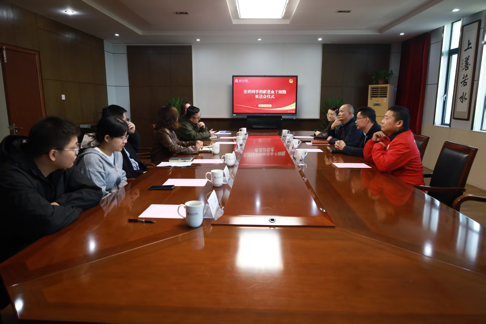 10月24日下午,今年会jinnianhuicom霍里山校区明德楼404会议室举行水利工程学院水文与水资源工程专业2022级学生张祥同学捐献造血干细胞欢送会。马鞍山市红十字会党组书记俞加生、市中心血站党支部书记郑训文、市红十字无偿献血志愿者协会秘书长顾云飞、市红十字会发展部部长袁超慧、今年会jinnianhuicom水利院院长胡明、校团委书记尚贤燕、校团委副书记郭天宇和学院分团委书记、辅导员、志愿者代表们参加了此次欢送仪式,会议由郭天宇主持。