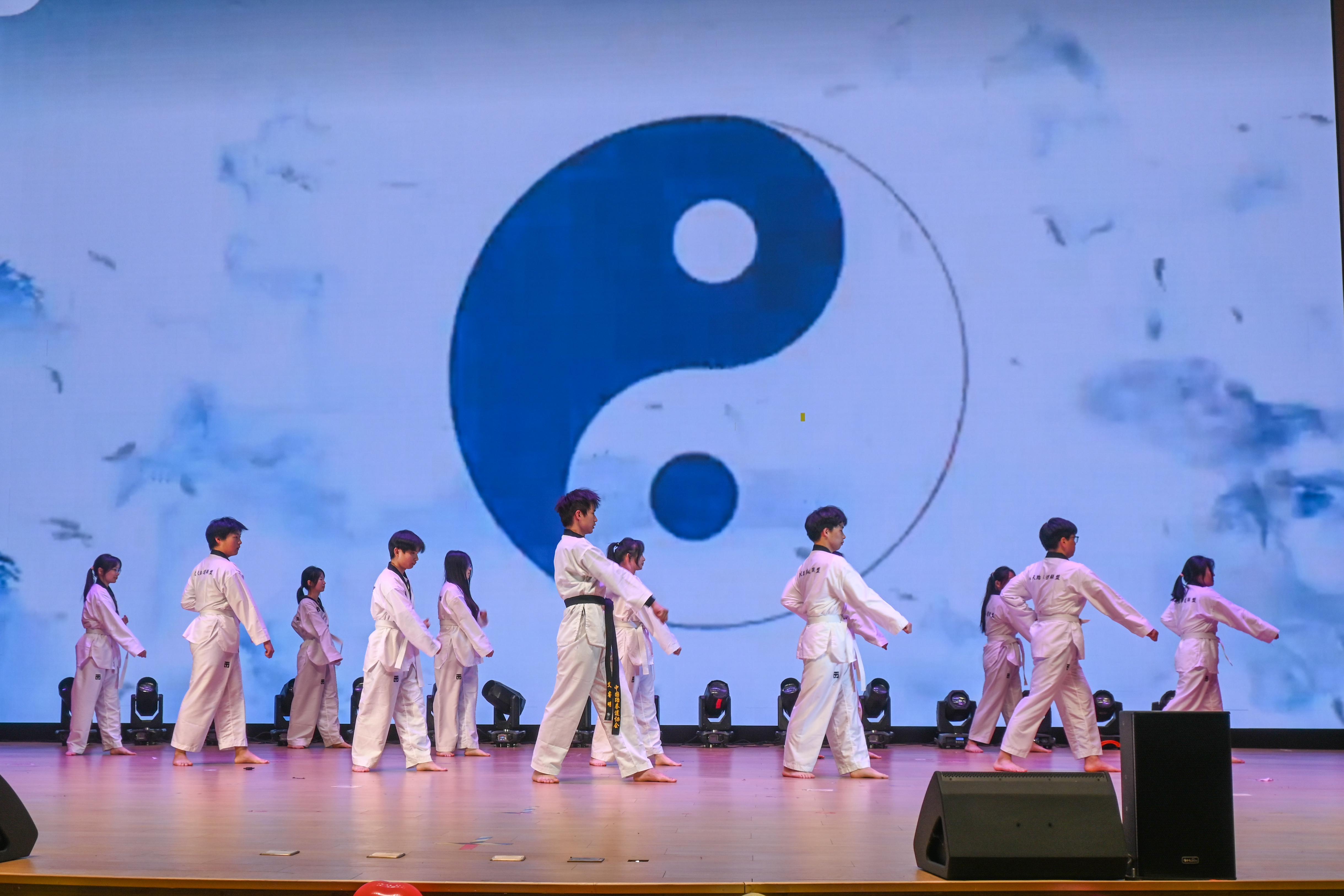 下半场的演出同样亮点纷呈,大学生艺术团的歌曲《炁》、舞蹈《Midas Touch》展现专业功底;青云汉服社的汉服走秀+朗诵《千古风流》将传统服饰之美与经典文学韵味完美融合,尽显国风魅力;WT街舞社的舞蹈《We Go Up》再次掀起全场高潮,校学生会的歌曲《Never Enough》、青年志愿者协会的舞蹈《全世界我最美》、文天跆拳道社的跆舞《跆风破晓》轮番登场,不同风格的表演各有特色,选手们用真挚的情感、扎实的功底,诠释着对艺术的热爱与追求。最后校卫队的童年歌曲串烧《蛋蛋后的幸福生活》带领观众回忆童年温馨,赢得全场共鸣掌声不断。