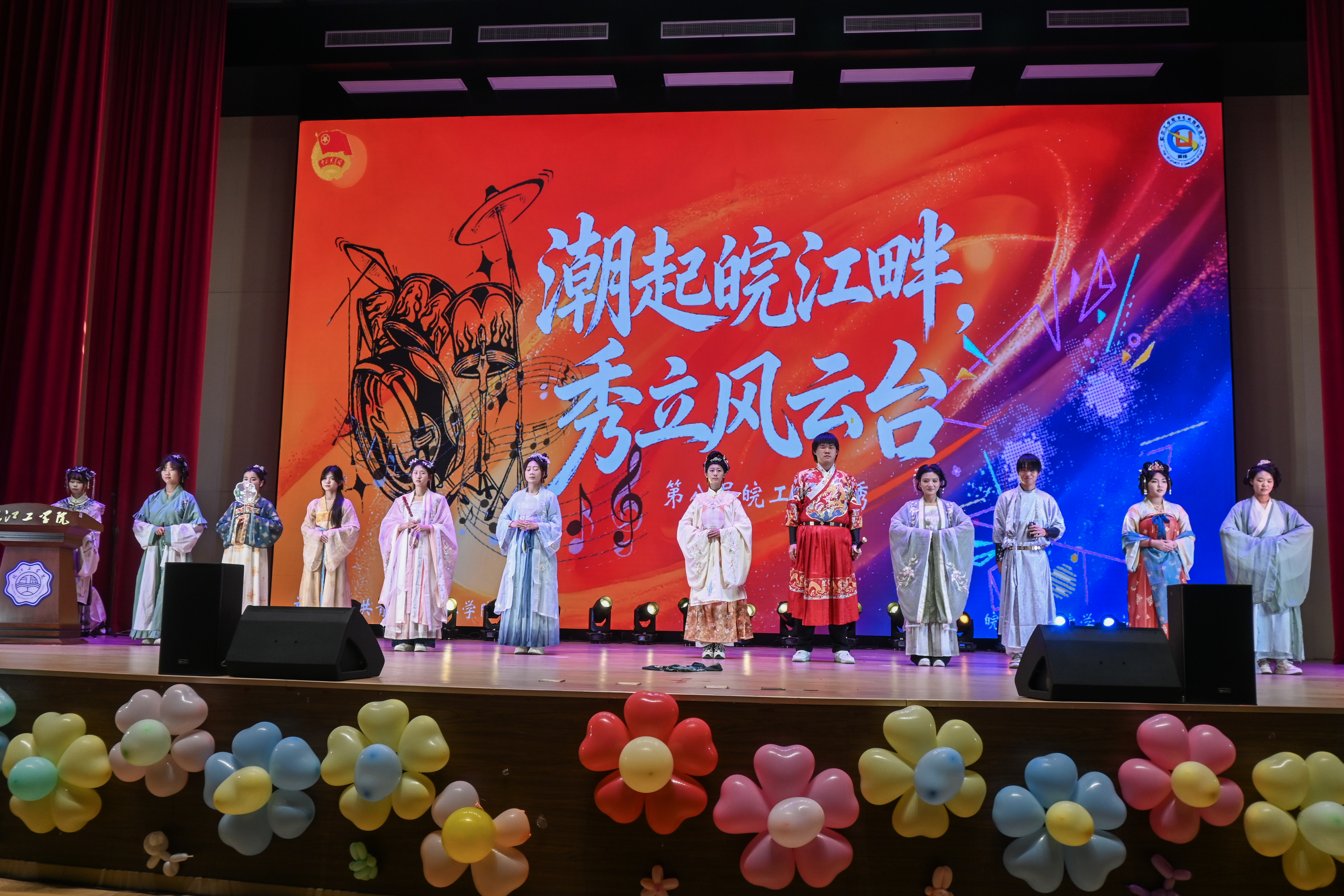 现场氛围热烈有序,整体设置上下半场展演及中场互动环节,节目涵盖各个社团报送的舞蹈、歌曲、话剧、汉服走秀、朗诵等多元类型,充分展现皖江学子创新素养与综合风采。上半场,WT街舞社带来的舞蹈《Killinitgirl》活力开场,瞬间点燃全场氛围;琴潮吉他社的歌曲《那个男孩》温柔治愈,传递青春情愫;团学组织建设委员会的舞蹈《幻想童话》灵动俏皮,麦芽创意气球社的话剧《是谁杀死了周日》创意十足,大学生艺术团接连带来《那是你离开了北京的生活》《Sexy Back+Trouble Maker》《大象的葬礼》等歌舞表演。中场互动环节——“逛三园”趣味游戏,送出两副小米手环,会场上空欢笑声、欢呼声此起彼伏。
