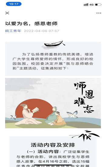 校团委坚守思想宣传主阵地,充分利用各级团属新媒体矩阵主动发声,开展正面宣传和引导,凝青聚力彰显战“疫”路上的青春担当。定期推送抗疫知识、宣传抗疫政策,开展“以爱为名、感恩老师”我与老师合影征集、“献礼建团百年微视频”征集、“喜迎校庆·情系皖工”征文、摄影、视频征集活动等,同时在新媒体平台上同步展示优秀作品。