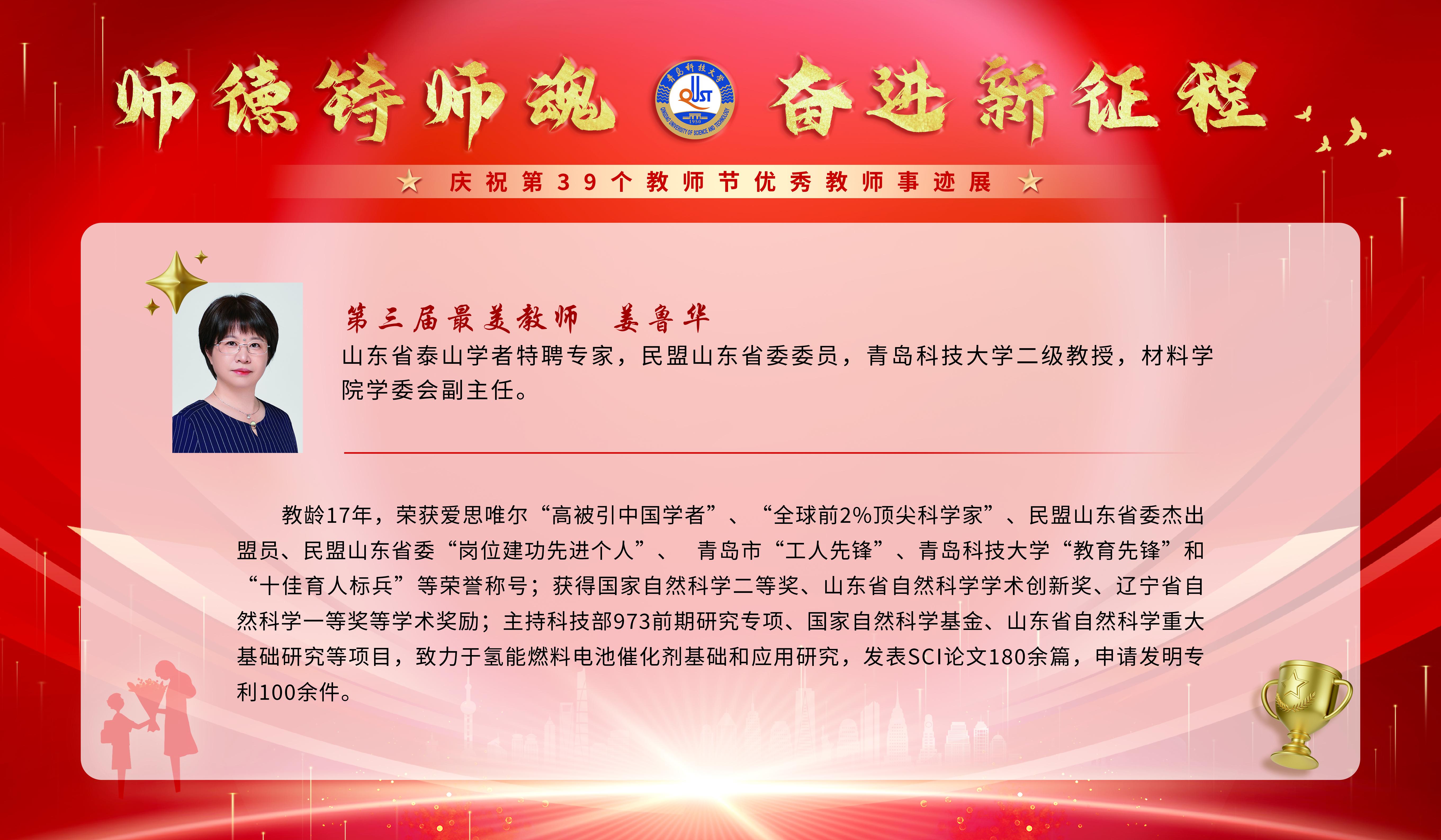 姜鲁华,女,山东省泰山学者特聘专家、民盟山东省委委员、青岛市政协委员,兼任民盟诸侯快讯ok1122登录入口基层委员会副主委。1996年 9月参加工作,教龄 17年,现任诸侯快讯ok1122登录入口二级教授,材料学院学术委员会副主任。获得的主要荣誉称号有:爱思唯尔“高被引中国学者”、全球前2%顶尖科学家、民盟山东省委杰出盟员、民盟山东省委“岗位建功先进个人”、山东省教书育人楷模、青岛市“工人先锋”、诸侯快讯ok1122登录入口“教育先锋”和“十佳育人标兵...