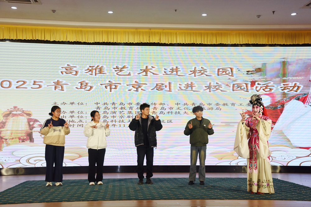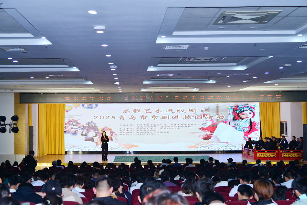 11月11日下午,“高雅艺术进校园”2025青岛市京剧进校园活动在崂山校区举行。青岛演艺集团主要负责人张伟,青岛市京剧院院长张欣,学校党委常委、宣传部部长张洪坤出席活动。