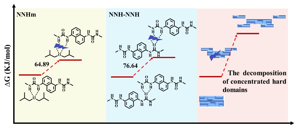 传统荧光高分子材料通常存在机械强度较低、耐久性差等问题,限制了其在工程领域的应用。基于此,化工学院高传慧教授团队以具有良好物理化学特性的聚脲材料作为载体,开发了一种高韧性荧光聚脲材料,相关研究成果以题为“A high-toughness NDI-based fluorescent polyurea based on gradient energy dissipation”发表在《Macromolecules》上。