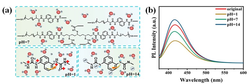 该材料在强酸、强碱及高温等极端环境中仍保持稳定荧光,无猝灭现象,展现出优异的稳定性。材料经过不同pH溶液处理后,荧光测试表明:中性与酸性条件下荧光强度下降,碱性条件下增强。在碱性环境中,脲基团去质子化形成负电荷,增强萘环电子云密度与共轭程度,提升荧光强度;中性水溶液中萘环周围氢键结构解离,刚性降低,致使荧光减弱;酸性条件下脲基团质子化,电子云密度下降,导致荧光衰减。尽管荧光强度随环境变化有所波动,材料整体光性能稳定,具备在极端条件下应用的潜力。