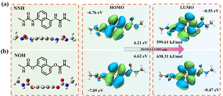 图2萘环上的取代基为脲基(a)和氨基甲酸酯(b),NNH(取代基为脲基)和NOH(取代基为氨基甲酸酯)的分子结构图、高斯结构优化后的球棍模型、前线轨道能量表述及空穴电子密度分布图
