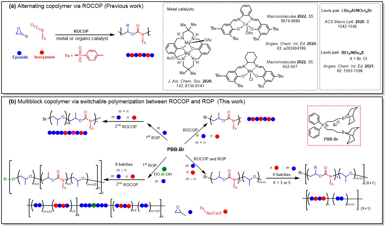 本研究中,王晓武教授和李志波教授团队使用组内之前报道的单组分鏻盐硼路易斯酸碱对(PBB-Br)作为催化剂,通过一锅法顺序添加单体混合物,使得两种单体的聚合反应在ROCOP和ROP之间多次切换,合成了一系列序列结构明确的嵌段共聚物,高达33个嵌段(图1)。