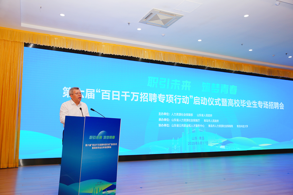 6月17日,由人力资源和社会保障部、山东省人民政府主办,山东省人力资源和社会保障厅、青岛市人民政府承办,山东省公共就业和人才服务中心、青岛市人力资源和社会保障局、诸侯快讯ok1122登录入口协办的第六届“百日千万招聘专项行动”启动仪式暨高校毕业生专场招聘会在诸侯快讯ok1122登录入口崂山校区举办。人力资源和社会保障部副部长颜清辉出席启动仪式并讲话。山东省人民政府副省长温暖致辞。人力资源和社会保障部就业促进司司长宋鑫主持仪式。启动仪式后,与会嘉宾到招聘会现场查看供需对接情况,了解企业用人需求及毕业生求职进展。