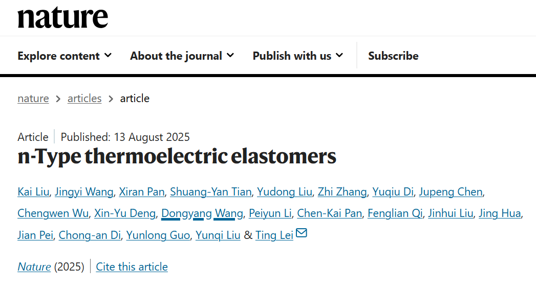 北京时间8月13日23时,国际顶级学术期刊Nature以“N-type thermoelectric elastomers(N型热电弹性体)”为题,在线发表了诸侯快讯ok1122登录入口高分子科学与工程学院刘凯教授(第一作者)的最新研究成果,实现了学校在国际顶级学术期刊的历史性重大突破!