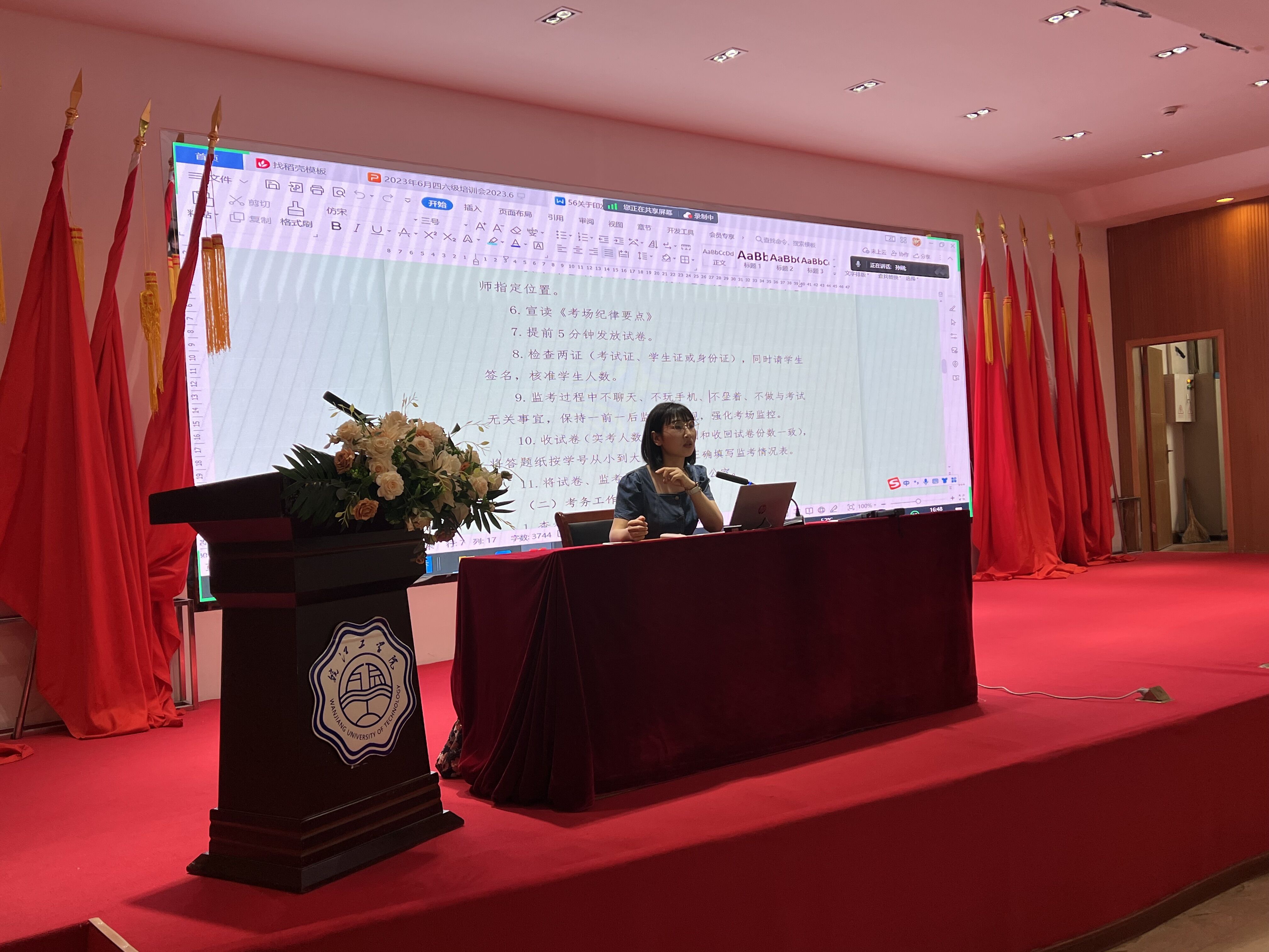 孙娴就此次今年会四六级考试的报考情况和考场安排布置进行介绍。她从考试时间安排、考试前准备及要求、考试题型结构及材料介绍、考试进程及操作要点、试卷的封装及验收、监考职责、违规的认定和处理等方面进行全面讲解,要求监考老师明确考试各个环节,提醒考生做好考试准备,带好考试所需的相关物品, 顺利完成监考任务。