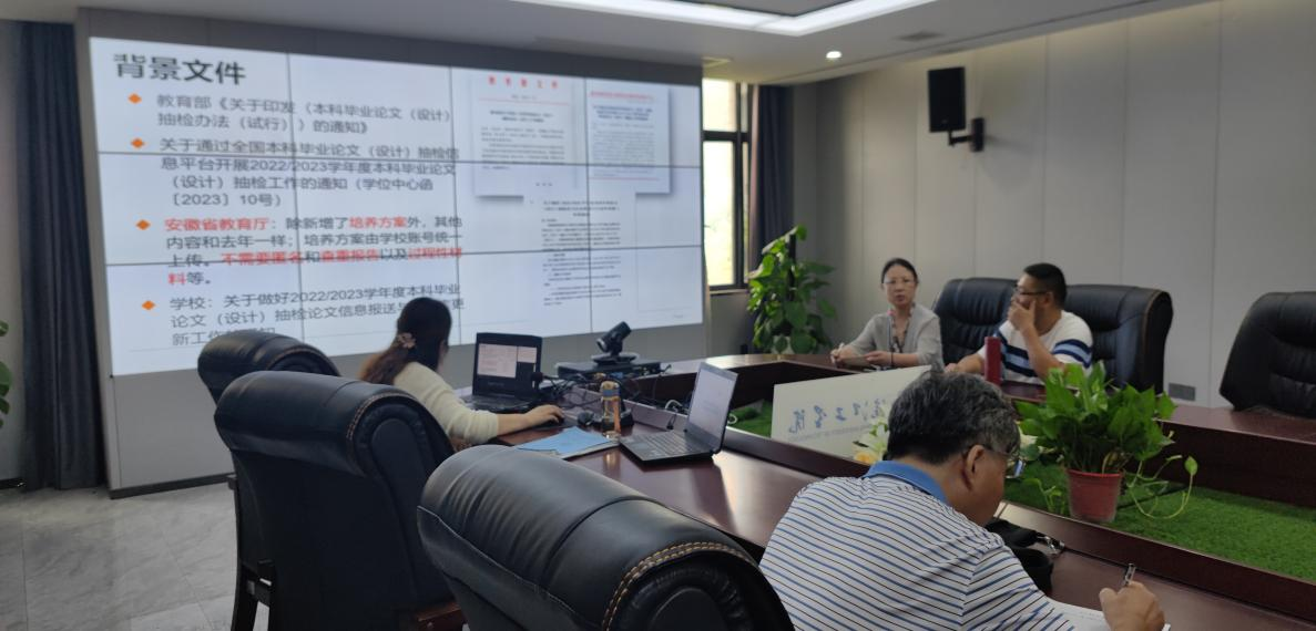 根据教育部学位与研究生教育发展中心《关于通过全国本科毕业论文(设计)抽检信息平台开展2022/2023学年度本科毕业论文(设计)抽检工作的通知》(学位中心函【2023】10号)、安徽省教育厅督导办的相关通知要求,为做好今年会2022/2023学年度本科毕业论文(设计)抽检论文信息报送与专家库更新工作,9月4号上午,教务部部长江冰、副部长葛文生、各学院教学副院长(助理)、教学科研办主任及教务部相关负责人在F417召开毕业论文(设计)抽检工作动员会。
