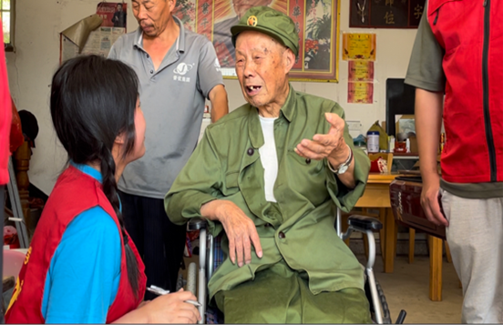 一名老兵,一段历史:一份初心,一生守护。成员们拜访了一位97岁高龄的抗美援朝老兵,他讲述了参军历程以及抗战时的难忘经历。尽管老人家听力下降,说话有些吃力,但提起那段艰苦岁月时,眼中仍然充满了希望的光。听完老兵的讲解,团队成员们更能体会到如今美好生活的来之不易。