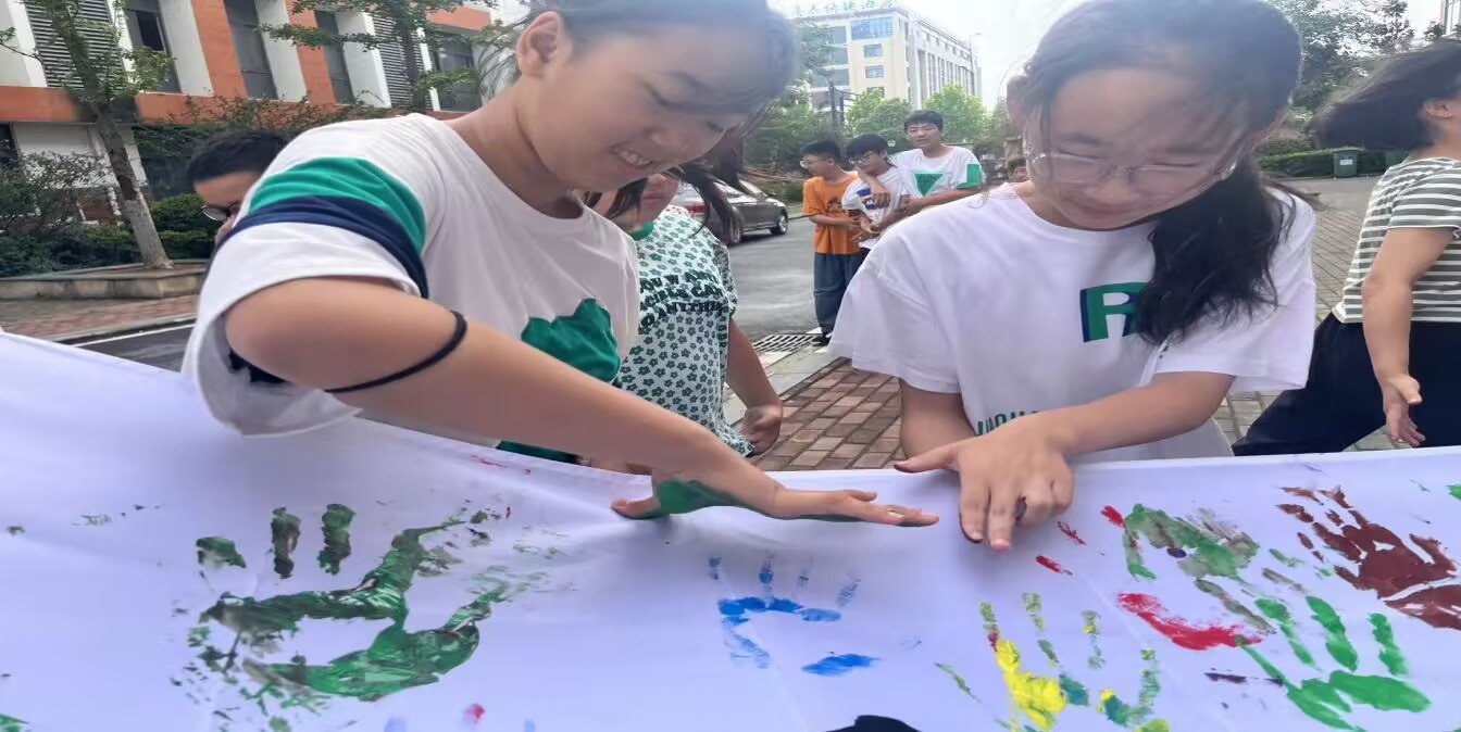 为了增强学生的艺术体验,促进学生的艺术修养养成。社会实践最后一日,社会实践团队开展了“有趣的手印打卡”活动。活动开始前,团队成员一同定制了此次“三下乡”社会实践活动的旗帜,组织校园内的学生们在旗帜上按下五彩斑斓的手印,留下了美好的回忆。同时积极倡导大家学习美术、体验美术、感知美术,提升艺术鉴赏能力和对美的感知能力。各年级学生们都踊跃参加,活动现场热闹非凡,充满了愉快欢乐的气氛。