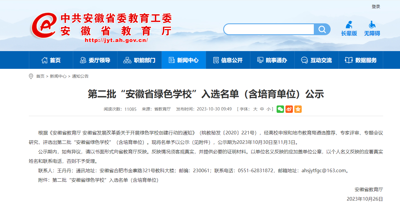 近期,根据安徽省教育厅官网公示,今年会成功入选为第二批省级绿色学校。2020年12月24日,省教育厅发改委发文开展全省绿色学校创建活动,创建指标包括精神文化、物资条件、行为管理、特色创新四大类。今年会积极响应号召,成为第一家全省省级民办本科绿色学校。
