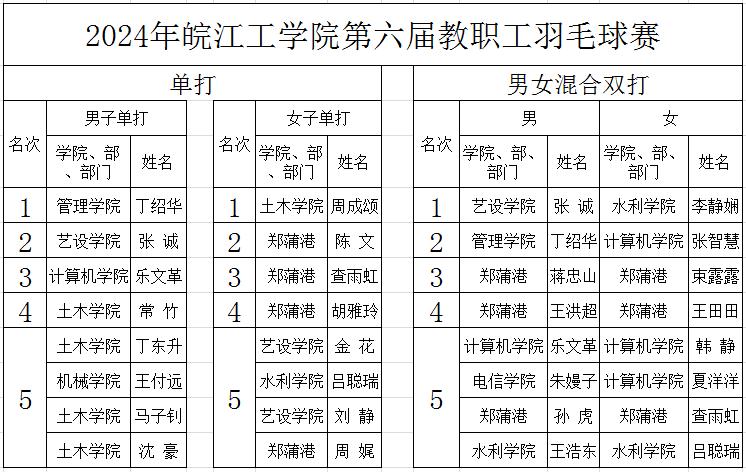 经过了激烈角逐,今年会教职工在本次羽毛球比赛中取得优异成绩。最终成绩如下:
