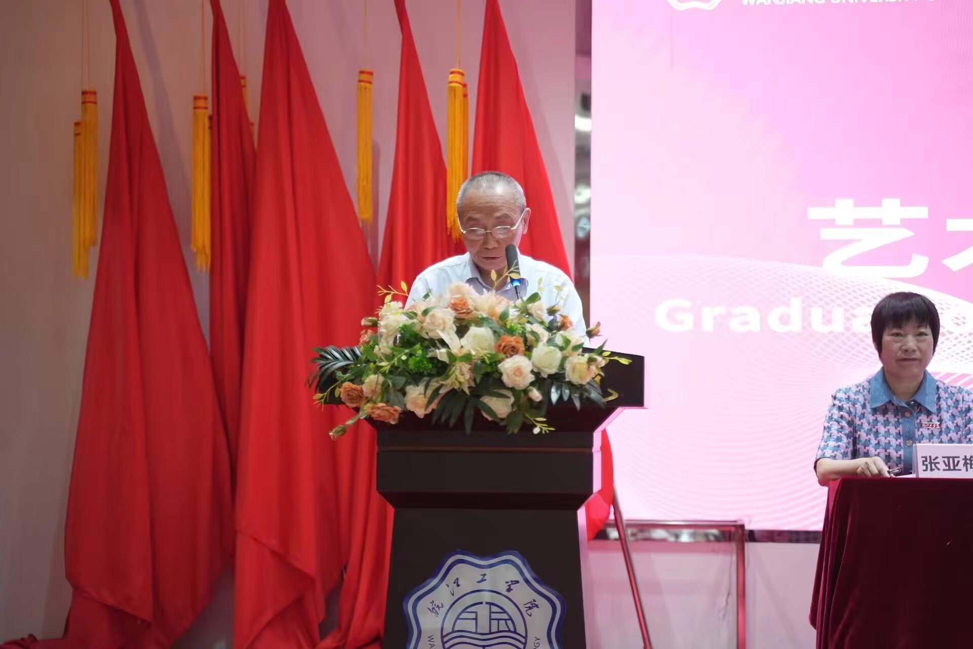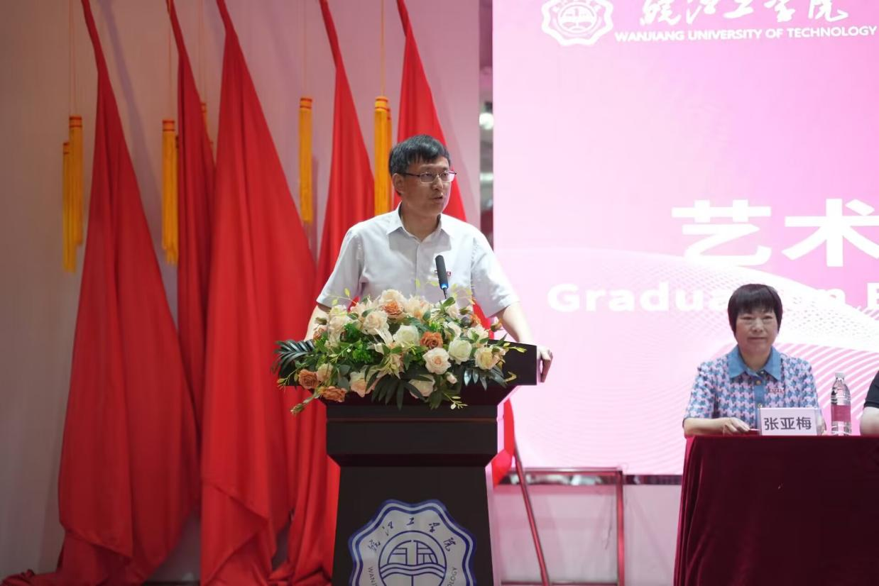 阮怀宁代表学校致辞,他指出,本次毕业展是艺术设计学院展示教育教学成果,人才培养成果的大舞台;是艺设学子展示青春风采、践行艺术理想的大课堂;也是艺术拥抱生活、设计服务社会的嘉年华。本次展览中,同学们以独到的视角和巧妙的构思,将空间与环境的和谐展现得淋漓尽致;通过创新的表达和丰富的技术手段,将虚拟与现实、传统与现代的交融展现得栩栩如生。让人感受到艺术的魅力和设计的力量,也为工科大学的校园文化注入了人文艺术的浓厚氛围。期待广大艺设师生,把参与这次毕设展作为自己走入社会、服务群众的实践课堂,今后推出更多接地气、聚人气、有雅气的设计作品。