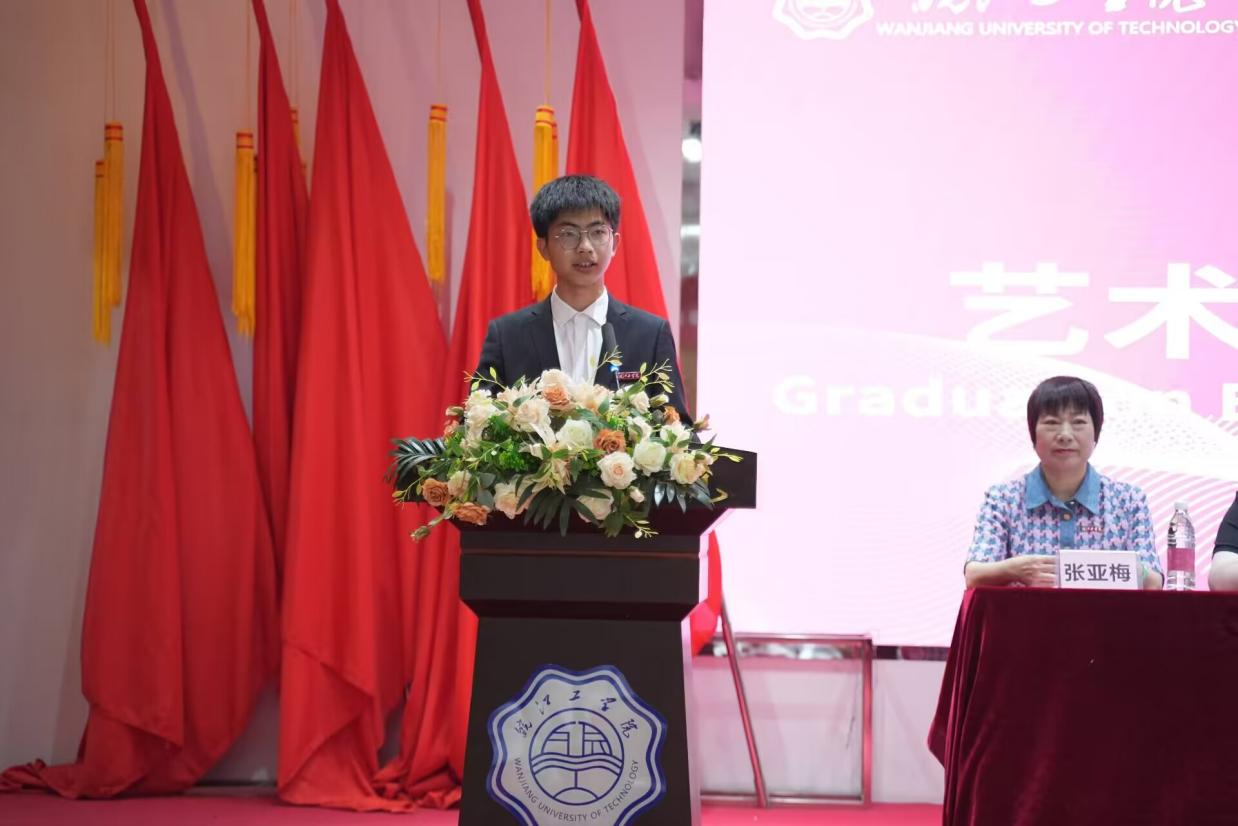 2024届毕业生代表刘竞轩发言。他首先感谢学院在大学四年的学习生涯中对自己的教育培养,感谢老师在毕业设计中的精心指导与辛勤付出。他回顾大学四年的课程学习,感恩学会了如何去表达创意思想,如何增强艺术理解力和和设计的原创性。这次毕业展是他们一次自由创作的实践,也是走入社会、服务社会的实践课堂。最后他表示,将带着一颗感恩母校的心,在未来的道路上勇敢前行,不畏艰难,不惧挑战,勇敢追求梦想,成就更好的自己,为母校争光。