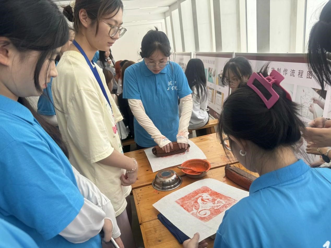 实践成员们亲身体验了木刻雕版印刷和捞纸这两项传统技艺。在木刻雕版印刷区,队员们通过亲手操作,感受到了古代印刷术的魅力和智慧。在捞纸环节,大家站在捞纸池旁,根据工匠师傅的指导,将纸浆均匀地捞在竹帘上。通过亲身实践和与工匠师傅交流,小组成员深刻感受到了在捞纸匠人的不易,由于双手长时间浸泡在纸浆中,皮肤会产生不适感:在冬天的时候,由于双手长时间处于冷水之中,冻疮、冻伤等情况更是经常发生。捞纸过程不仅考验师傅们的耐心,更考验师傅们的技艺熟练程度,薄如蝉翼非一日之功,而是日积月累的经验才能达到的。
