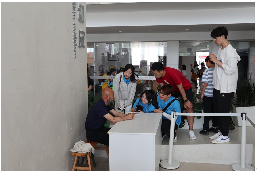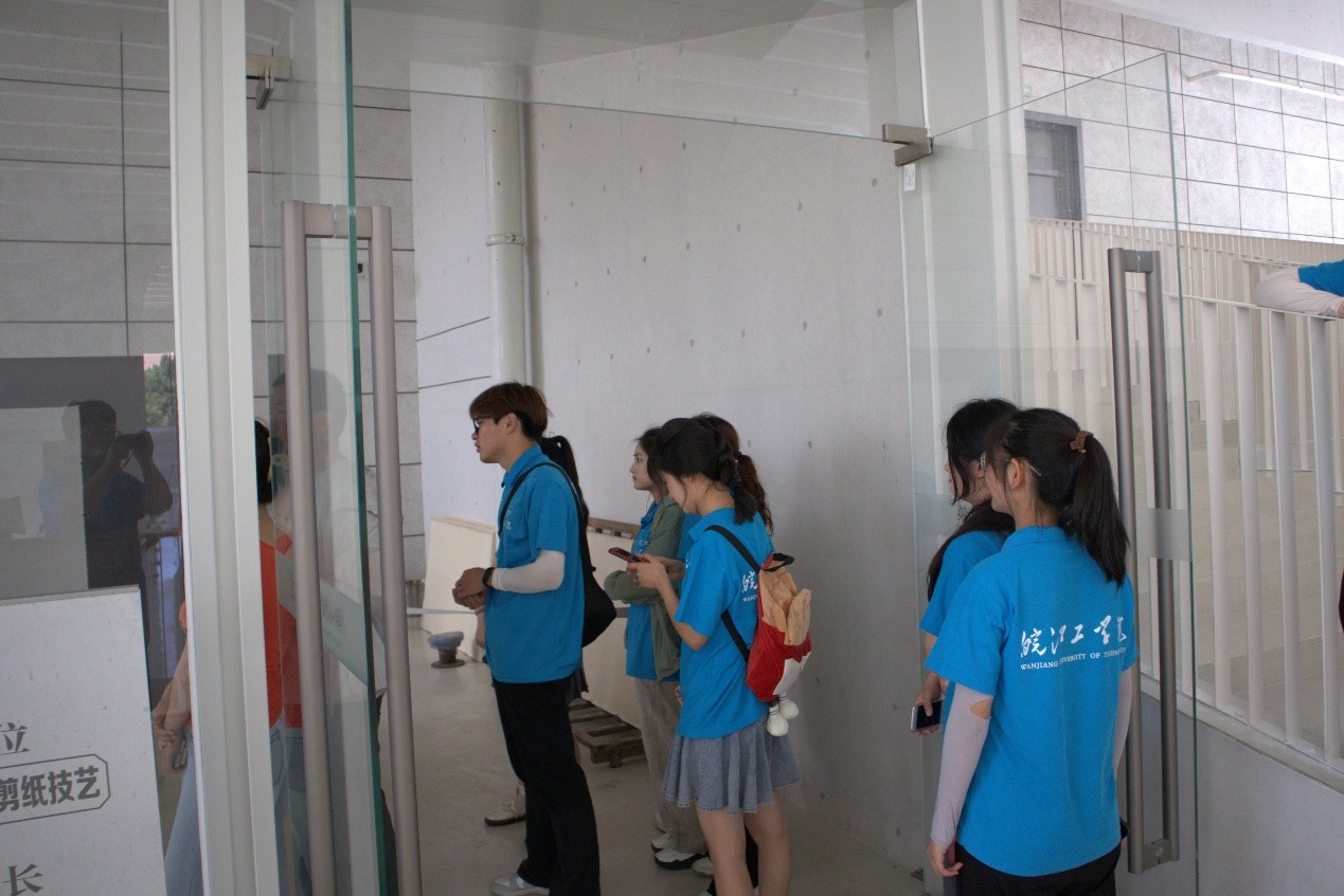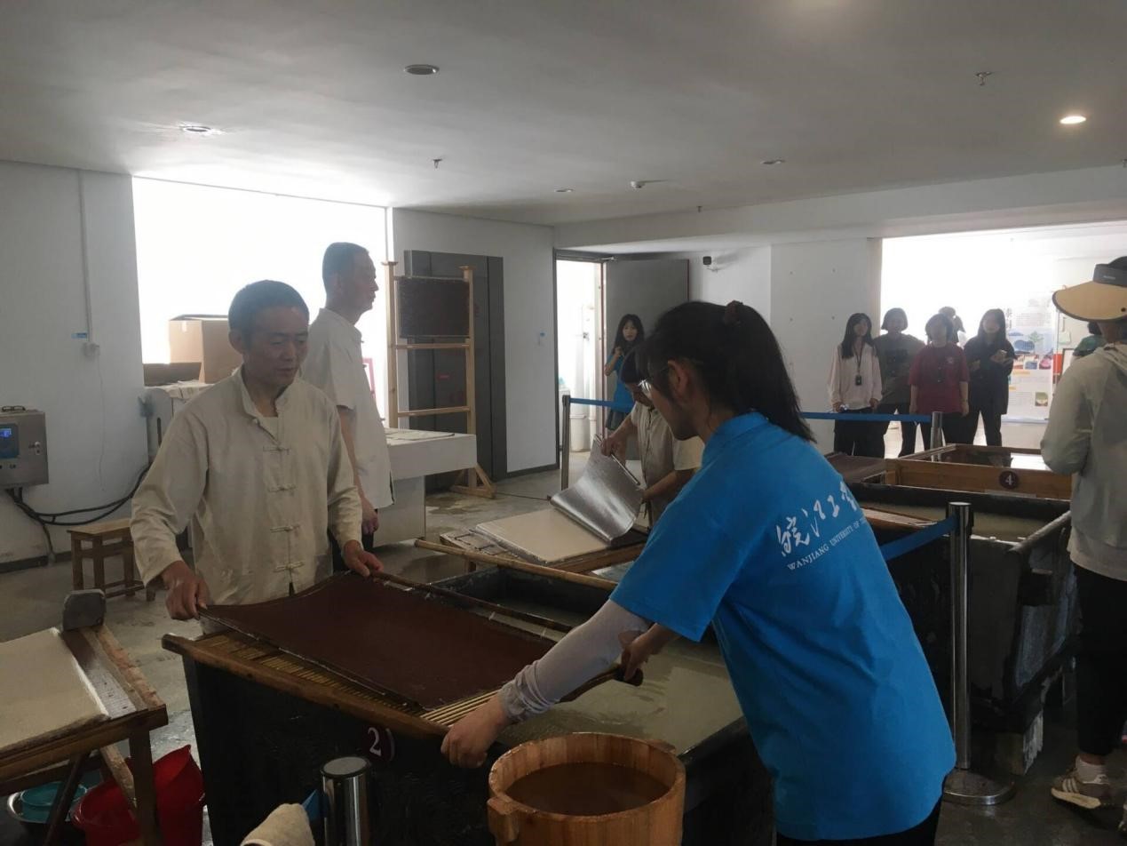 挂牌仪式结束后,实践队伍前往中国宣纸文化园。实践队在讲解员的带领下感受宣纸文化的历史底蕴,深入参观宣纸的制作过程。随后,大家来到“三丈三”车间,认真聆听导游的讲解,详细了解了“三丈三”宣纸从选料、晒滩、皮草选拣这些原材料的准备工作,到碓皮、切皮、踏料、袋料等材料处理,最后到捞纸、晒纸、剪纸等成品制作,其间工序繁琐,流程复杂,条件苛刻。他们亲眼学习到了工匠师傅们如何凭借高超的技艺和丰富的经验,将一张张质地优良的宣纸呈现于大家面前。
