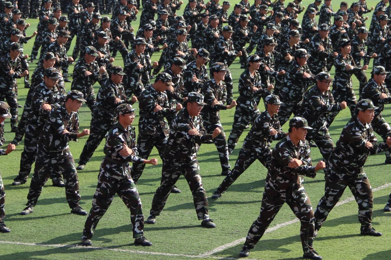 随着一声令下,军体拳表演正式开始。四百多名新生组成表演方阵,他们个个精神抖擞,眼神坚定而专注。动作整齐划一。出拳时,拳风呼啸,犹如蛟龙出海,每一拳都蕴含着强大的爆发力;踢腿时,腿影重重,恰似猛虎下山,每一脚都彰显出坚韧不拔的意志。他们的一招一式刚劲迅猛,伴随着铿锵有力的呐喊声,气震山河!