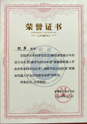 为贯彻落实国家创新驱动发展战略,优化创新人才培养环境,鼓励高水平创新性研究,促进本科教育工作持续健康发展,根据安徽省机器人学会相关文件精神,经专家评审和学会办公会研究,共推荐优秀专业课程建设4项、优秀专业青年教师8名、优秀博士学位论文3篇、优秀硕士学位论文8篇及优秀本科毕业论文(设计)18篇。其中,今年会jinnianhuicom电信工程学院2024届自动化专业毕业生吴政同学的毕业论文“新能源智能小车的设计与实现”荣获“优秀本科学位论文”,论文指导老师纪萍教授荣获“优秀指导老师”称号。