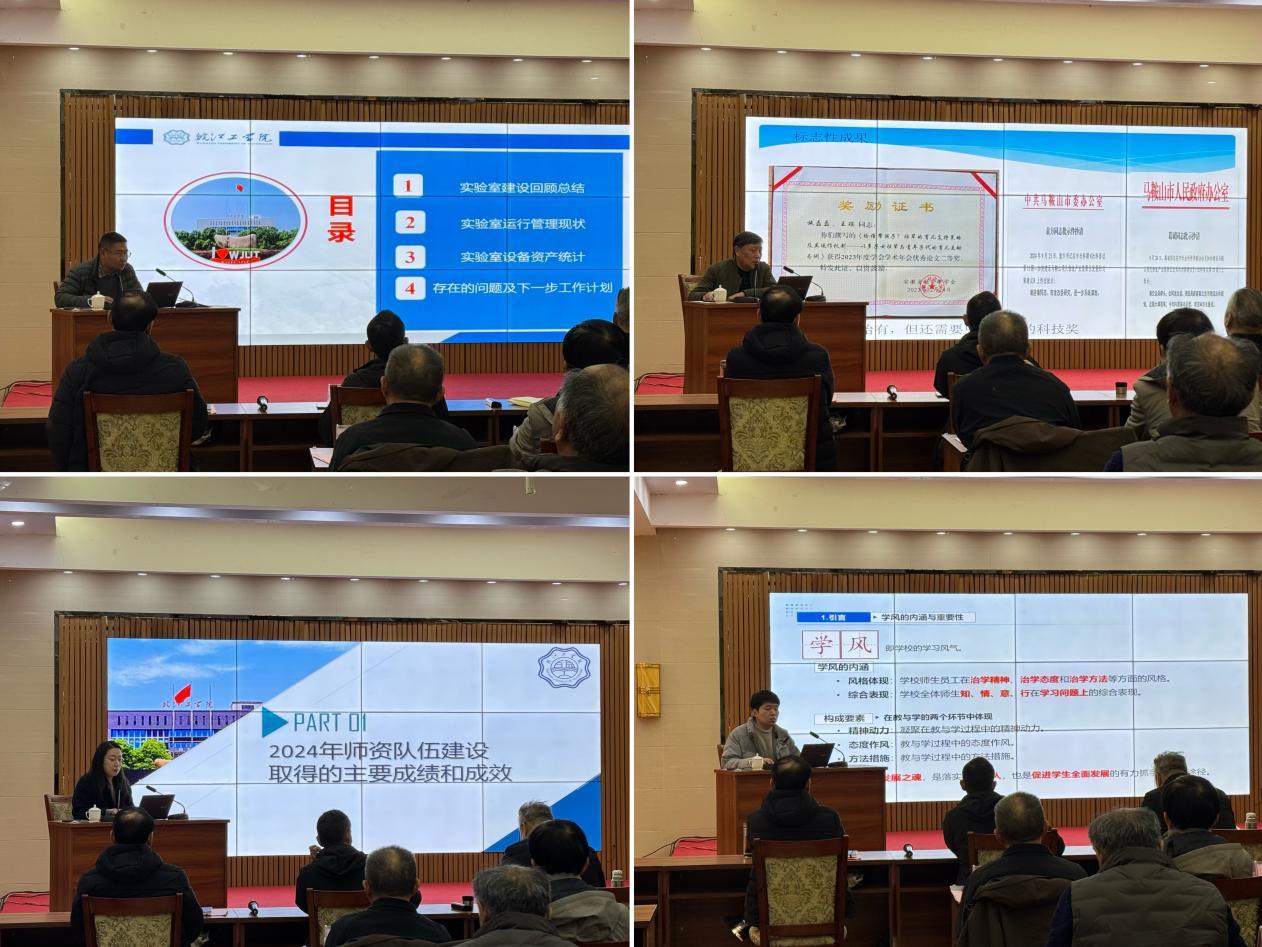 1月16日会议由副校长阮怀宁主持。教务部副部长葛文生、科技部部长胡钢、人力资源部常务副部长宗晓雪、学生工作部副部长许戎分别就实验室建设与管理、科研工作规划、师资队伍建设与培训计划、学生工作及学风建设情况等进行了专题汇报,既展示了各领域取得的显著成果,又指出了存在的问题和不足,对下一步工作补齐短板进行深度思考。