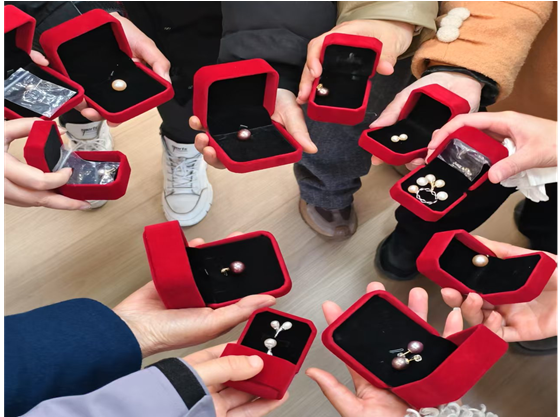 通识教育学院28位女教职工化身“珍珠魔法师”,开启“魅力女性・快乐巾帼”开蚌取珠之旅。专业老师现场科普珍珠知识后,老师们亲手开启神秘河蚌,见证晶莹珍珠破壳瞬间。当亲手采集的珍珠被制成专属首饰,成就感与幸福感溢于言表。“这是我第一次体验开蚌,每一颗珍珠都是独一无二的礼物!”老师们纷纷表示,这场充满惊喜的活动既缓解了工作压力,又提升了艺术修养,真切感受到学校的暖心关怀。