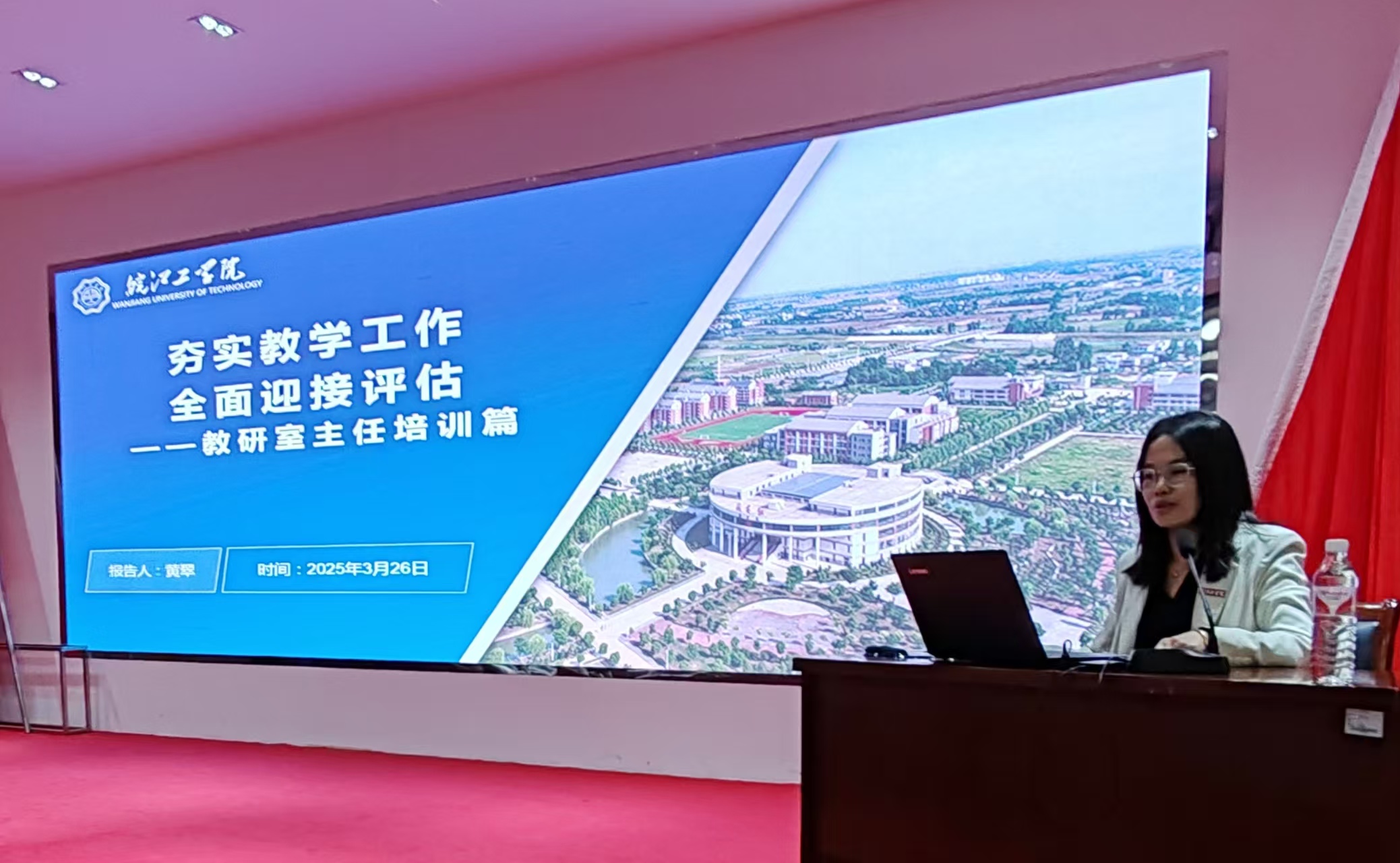 黄翠作《夯实教学工作 全面迎接评估》主题报告。她首先通报了目前学校的迎评准备情况,介绍了学院迎评工作流程,重点对专家进校考察重点如师资、教学运行、教学仪器设备、财务合规性检查等方面的标准要求进行解读,并对二级学院接下来的迎评准备工作进行了详细部署。