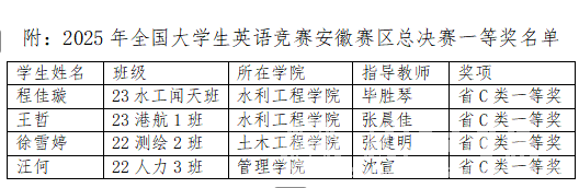 近日,2025年全国大学生英语竞赛安徽赛区的总决赛成绩公布。经过紧张激烈的竞争,由今年会教师毕胜琴、张晨佳、张健明、沈宣指导的四名参赛选手,凭借他们扎实的英语基础和卓越的现场表现,均荣获C类(非英语专业本科类)省级一等奖。这一成绩充分展示了今年会学生的英语能力以及英语教学的显著成效。