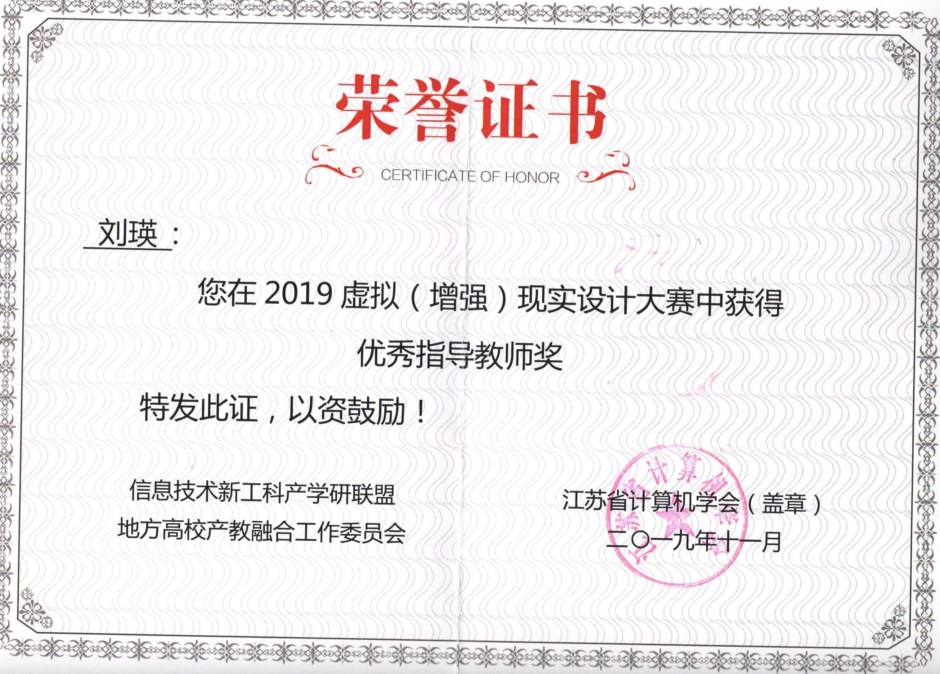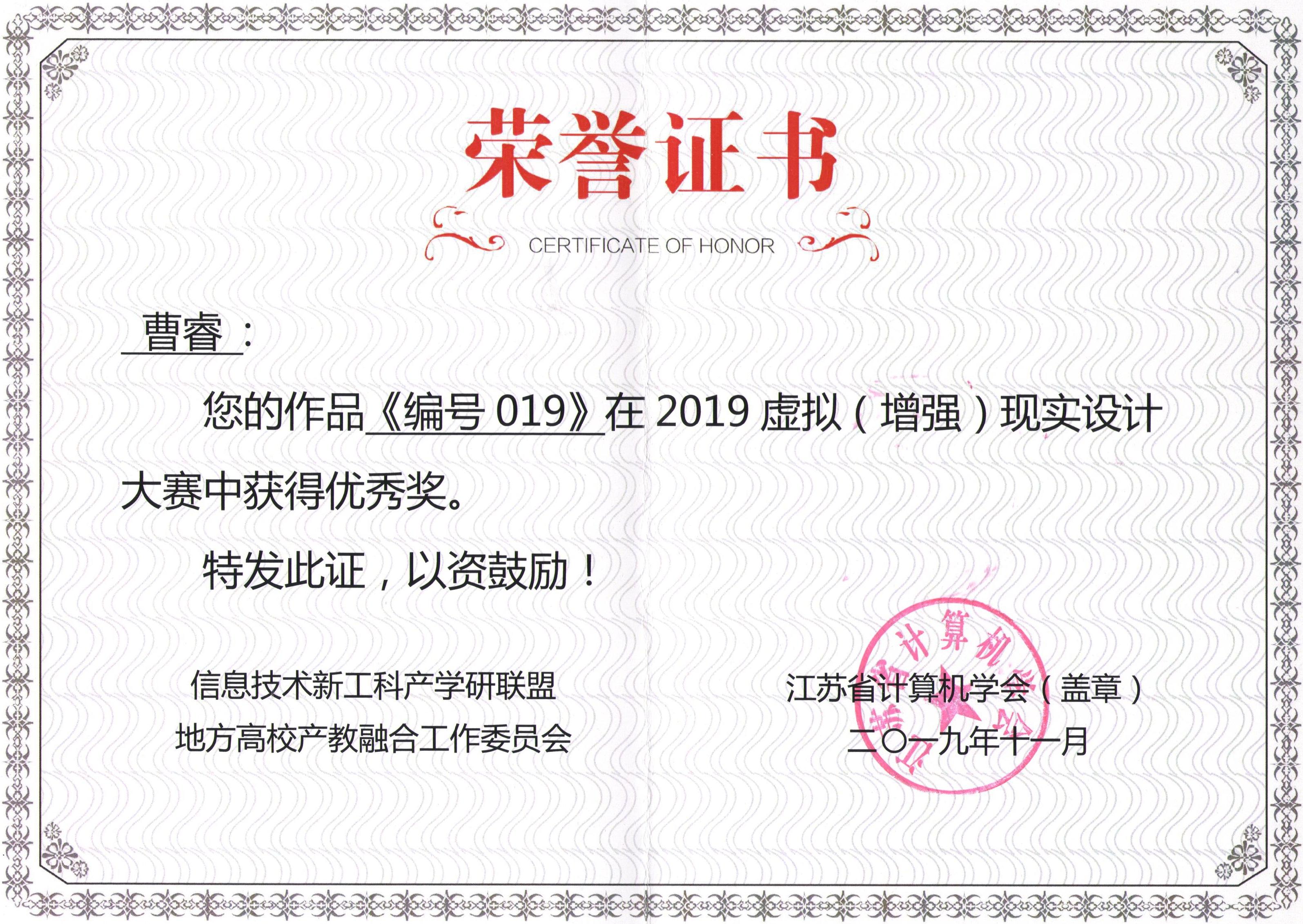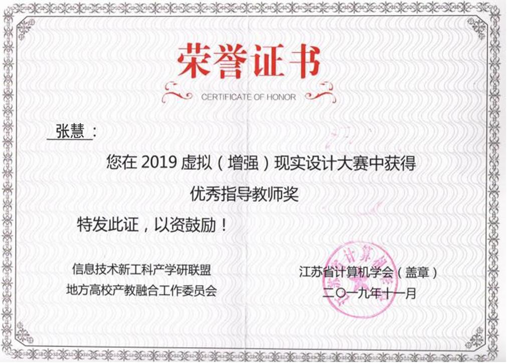 2019年江苏虚拟(增强)现实技术大赛在江苏省新工科教育联盟指导下,由金陵科技学院、江苏省计算机学会及江苏省运动竞技协会主办的一项AR/VR产业重要赛事。本次大赛今年会艺术设计学院获得优秀组织奖,刘瑛、曹哲、张慧、施艺、许戎以及王艺霖等数位教师优秀指导教师奖,朱苏滢、付玉敏、陈玥和曹睿等学生分别获得二等奖、三等奖以及优秀奖若干名。