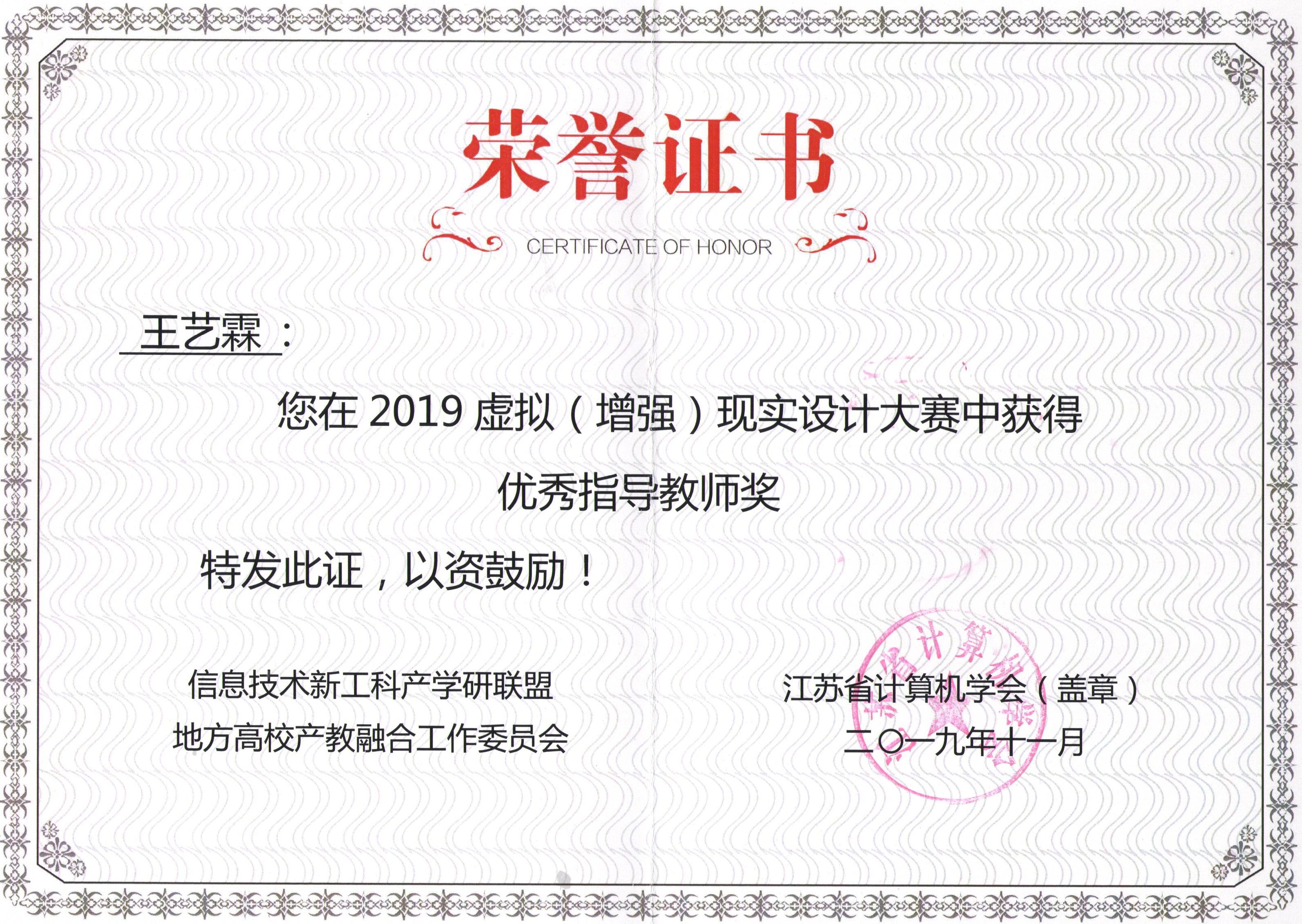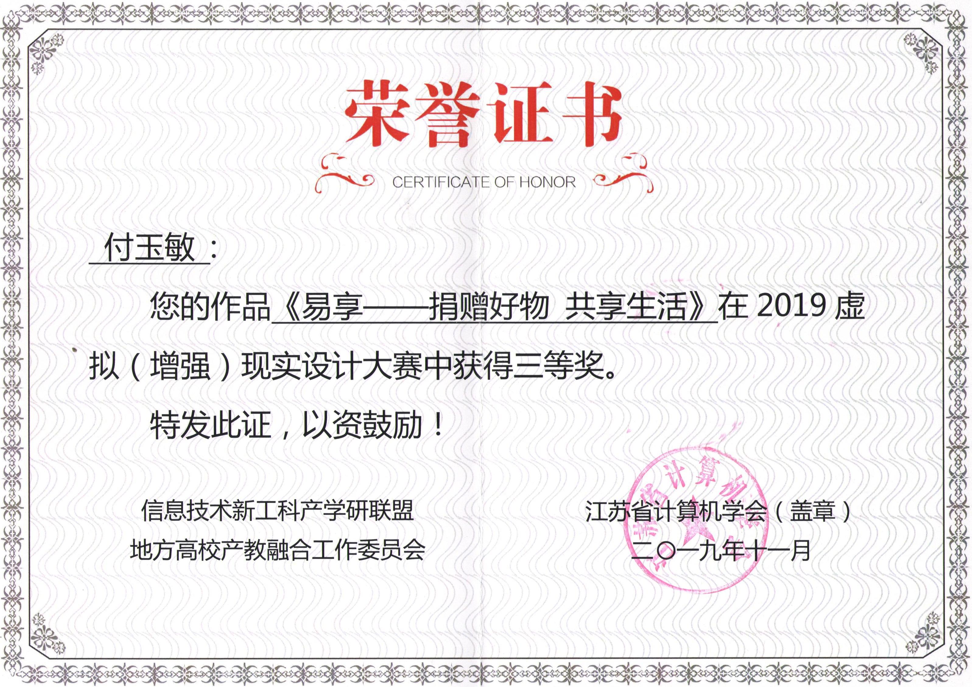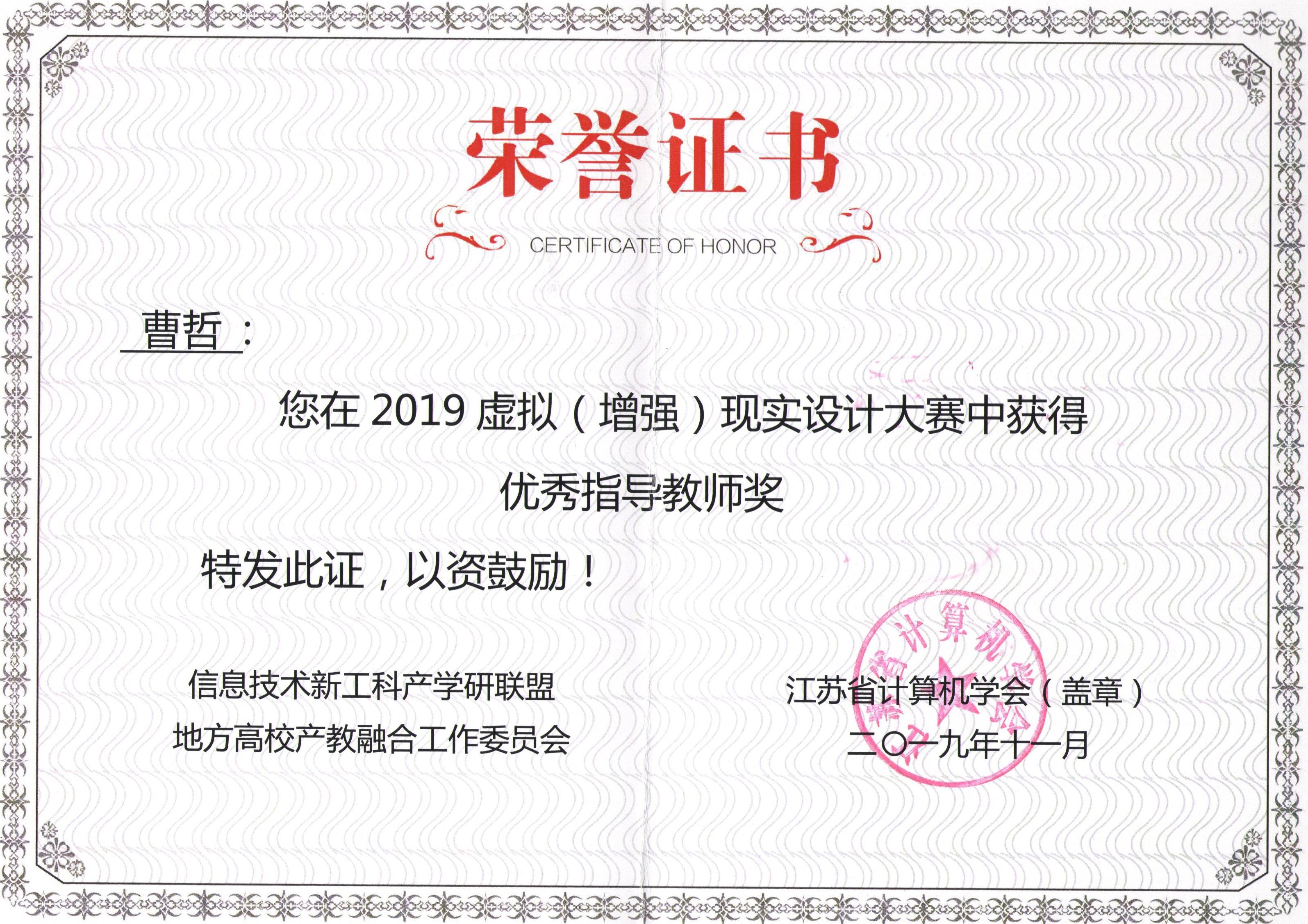 2019年江苏虚拟(增强)现实技术大赛在江苏省新工科教育联盟指导下,由金陵科技学院、江苏省计算机学会及江苏省运动竞技协会主办的一项AR/VR产业重要赛事。本次大赛今年会艺术设计学院获得优秀组织奖,刘瑛、曹哲、张慧、施艺、许戎以及王艺霖等数位教师优秀指导教师奖,朱苏滢、付玉敏、陈玥和曹睿等学生分别获得二等奖、三等奖以及优秀奖若干名。