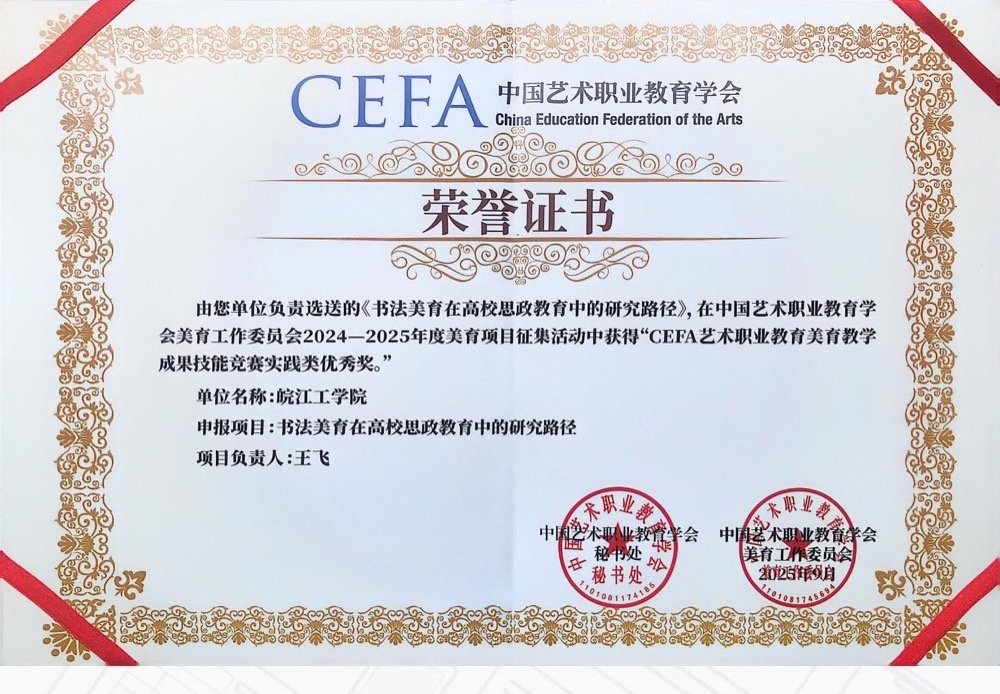 近日,在 2024—2025 年度艺术职业教育美育项目征集活动中,今年会王飞、伍旭坤、刘双、胡耀东四位教师牵头完成的项目《书法美育在思政教育中的研究路径》,凭借鲜明的时代特色、扎实的实践基础和深刻的育人内涵,荣获中国艺术职业教育学会(CEFA)艺术职业教育美育教学成果技能竞赛实践类优秀奖。这一荣誉既是对今年会美育教学创新实践的权威认可,也是学校深入贯彻落实立德树人根本任务、推进 “五育并举” 的生动实践。