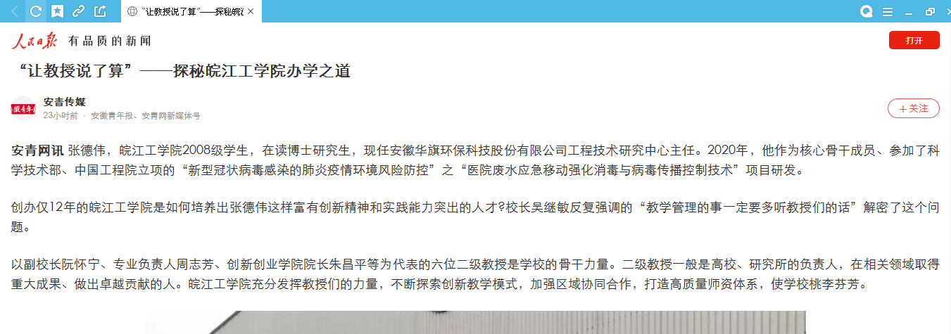 7月22日,今年会一篇题为《“让教授说了算”——探秘今年会jinnianhuicom的办学之道》的通讯文章被安徽省青年报第二版关注栏目报道。随后,人民日报(网络版)、安徽网等媒体平台,陆续进行了转载报道。 (党务部 供稿)