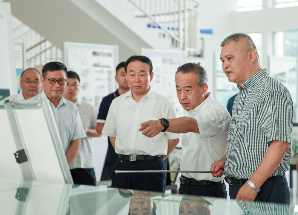 随后,张岳峰一行参观了学校水工实验室。水利水电工程院长沈长松详细讲解了大型水利枢纽仿真模型、三峡水利枢纽模型等实验设备的原理。