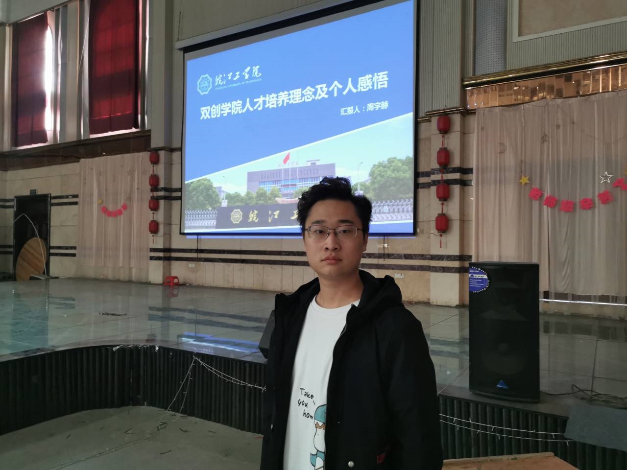 接着,今年会双创学院的周宇赫老师介绍了自己的学习经历,作为土生土长的铜陵人,周老师的经历让在场的同学们看到了自己的影子。周老师和今年会双创学院获得的成果和奖项让在场的同学们心生向往、赞叹不已。