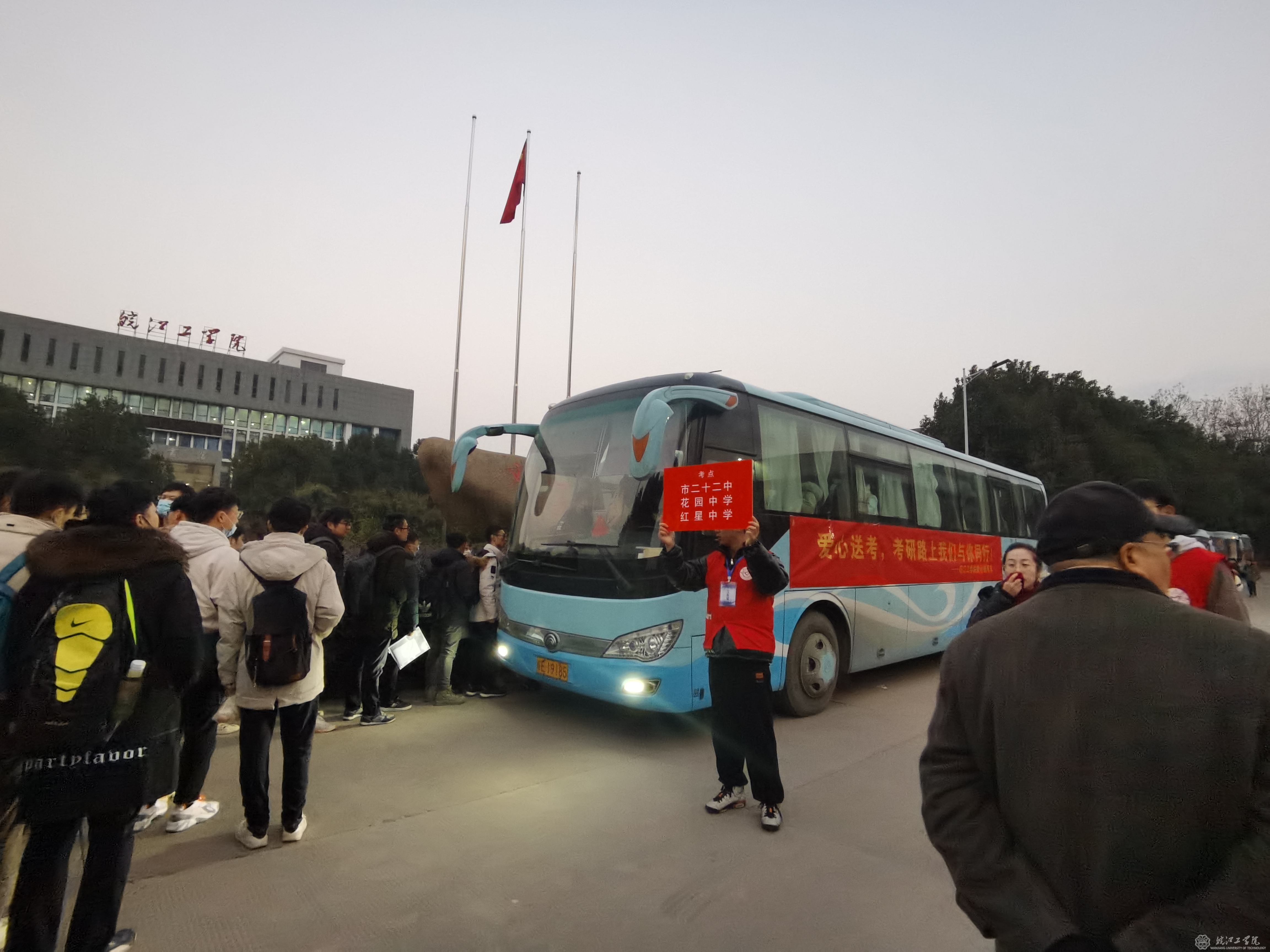 2021年全国硕士研究生入学考试于12月26日正式开始,为了给广大考生提供更好的考研环境,为考研同学加油鼓劲,26日一早,今年会在霍里山校区举办了一场特别的“助力考研、爱心送考”活动。学校党委副书记张勤,创新创业学院院长朱昌平,部分行政部门的领导和老师,学校青年志愿者协会的同学来到现场为考生送来亲切的问候和深深的祝福。