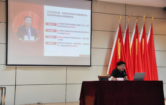 徐志伟围绕百年党史,用朴实的语言、生动的案例、新颖的视角通过小话题阐述大主题、小案例演绎大道理,为现场师生们上了一堂生动地党史课。宣讲内容紧紧围绕“深入学习领会习近平总书记关于党的历史的重要论述,充分认识开展党史学习教育的重大意义、认真研读党史基本著作,全面了解中国共产党百年的辉煌历程和历史贡献、深刻把握党史学习教育的重点、开展党史学习教育要学懂弄通做实习近平新时代中国特色社会主义思想,增强“四个意识”、坚定“四个自信”、做到“两个维护”。四个部分内容,权威准确、入情入理、深入浅出的讲解了党史的重要论述,并要求与会人员做到知史爱党,知史爱国,深刻了解学习党史的重要意义,同时鼓励青年学子躬身力行,坚定不移跟党走,接续奋斗,在闪光的青春中书写最美丽的人生!
