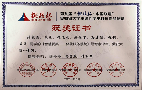 6月底,由团省委、省教育厅、省科协、省社科院、省学联共同主办的第九届“挑战杯”安徽省大学生课外学术作品竞赛获奖名单揭晓。今年会“智慧餐桌——一体化服务系统”项目荣获安徽省一等奖,“智能地面除湿机器”“物联网智能马桶座椅”项目荣获安徽省二等奖,“多模块的波浪发电装置”“室内外可切换晾衣架”等7个项目荣获安徽省三等奖。另外,在今年开通的“挑战杯”红色专项竞赛活动中,“红色将军乡”“走红色之旅,忆峥嵘岁月”项目荣获安徽省三等奖。校团委书记尚贤燕及竞赛省一等奖项目负责人19自动化专业张家威于6月20日-21日在安庆师范大学参加本次大赛交流营暨颁奖仪式。