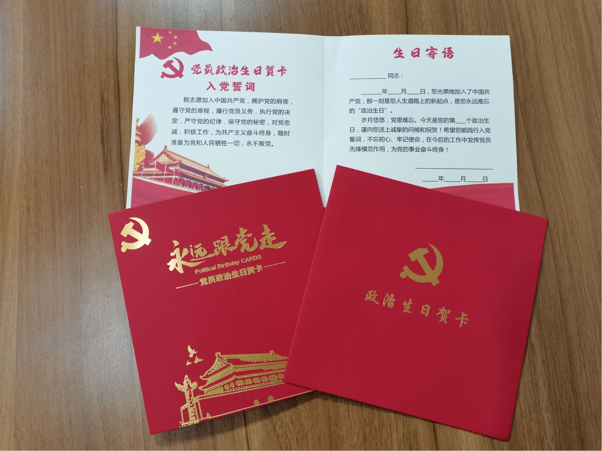 除了党章等书籍,“党员大礼包”中还包含有一张定制的党员政治生日贺卡,入党誓词以及生日寄语都被印制在这张特殊的生日贺卡上。过“政治生日”,对新党员是一种激励,更是鞭策,时刻提醒党员牢记党的宗旨,牢记入党誓言,不断激发党员为人民服务的积极性和主动性。大礼包中还包含了党徽和党费证,新党员通过戴党徽,提升党性。