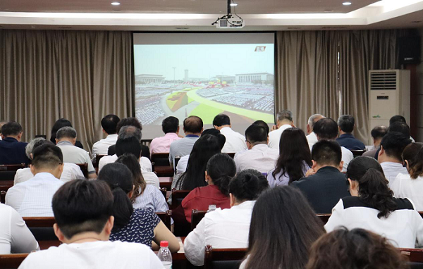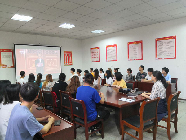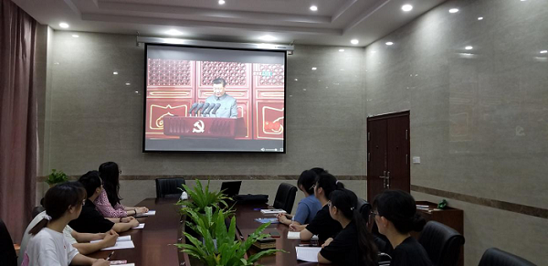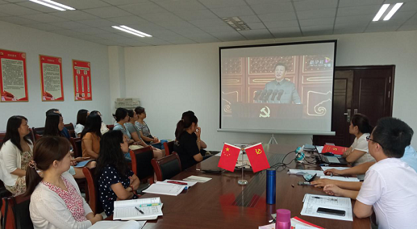 学校领导班子成员、各党总支书记、副书记等人员,在行政楼会议室集中收看了大会直播。全体人员佩戴党徽、端坐台下,聚精会神地观看,并不时记录习近平总书记重要讲话内容。