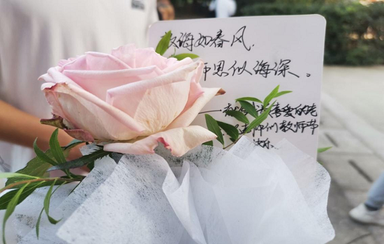 同学们亲手写上一句句简单而温馨的话语“献给最喜爱的老师,教师节快乐!”“老师,您好!老师,您辛苦了!”“十年树木百年人,老师恩情比海深”......一朵朵、一张张静候在教学楼、图书馆、水利楼、行政楼、操场边期待着过往同学取下的花朵和贺卡,献给自己最喜爱的老师,带去清晨的第一句节日问候。亲切的话语,幸福的笑脸,让今晨的校园洒满了同学们的祝福,充满了节日的温情!