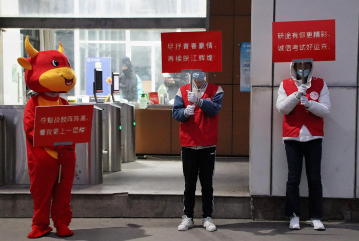 志愿者们或身着“牛气服”,或高举“研途有你更精彩,诚信考试好运来”“从容提笔一研为定,机械学子一战成硕”等加油标语,以多种方式为考研学子打气,缓解考前压力。