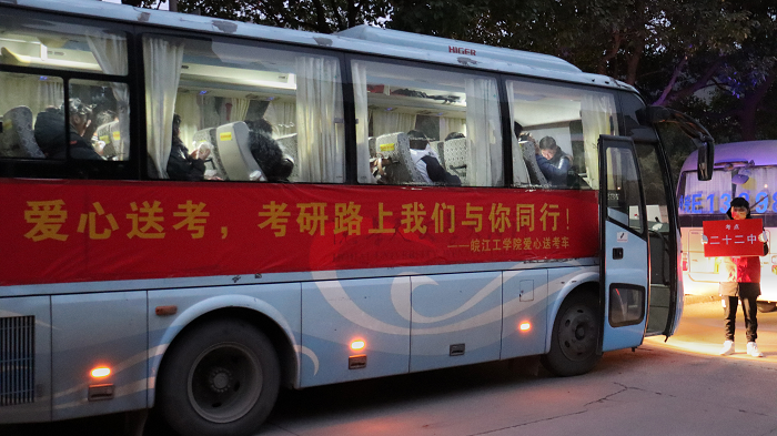 早上6点50分,爱心送考车已经在霍里山校区大门口整装待发,车身悬挂着“爱心送考,考研路上我们与你同行”横幅,每辆车前都有学生志愿者手持考点牌,提示学子车辆路线。